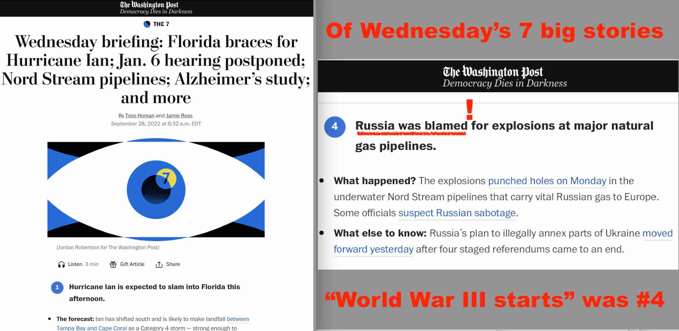 As shown in the screenshot above, The Washington Post considered the biggest single act of economic and ecological terrorism in history to be only the fourth most important story of the day, behind “Ian Threatens Florida,” “Ian Hits Cuba,” and “House Postpones J-6 Hearings (Due to Ian).” It is as if Big Brother decided to send a hurricane through the brains of Americans to wash away their awareness of the colossal crime their government had committed in the North Sea.