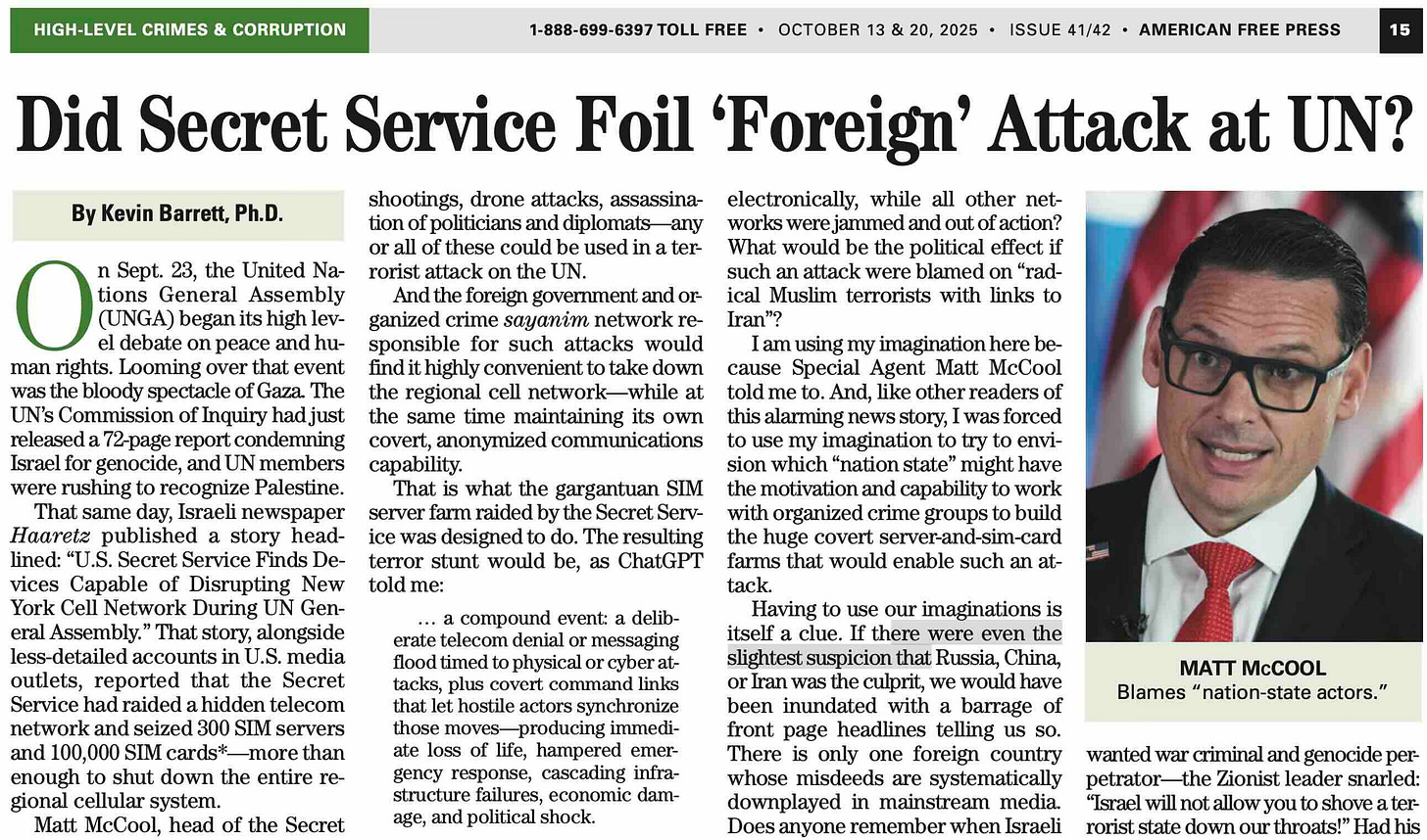 It doesn’t take much imagination to envision “some sort of other event associated with UNGA.” Bombings, shootings, drone attacks, assassination of politicians and diplomats—any or all of these could be used in a terrorist attack on the United Nations. And the foreign government and organized crime sayanim network responsible for such attacks would find it highly convenient to take down the regional cell network—while at the same time maintaining its own covert, anonymized communications capability. That is what the gargantuan sim server farm raided by the Secret Service was designed to do. The resulting terror stunt would be, as ChatGPT told me, “a compound event: a deliberate telecom denial or messaging flood timed to physical or cyber attacks, plus covert command links that let hostile actors synchronize those moves — producing immediate loss of life, hampered emergency response, cascading infrastructure failures, economic damage, and political shock.”