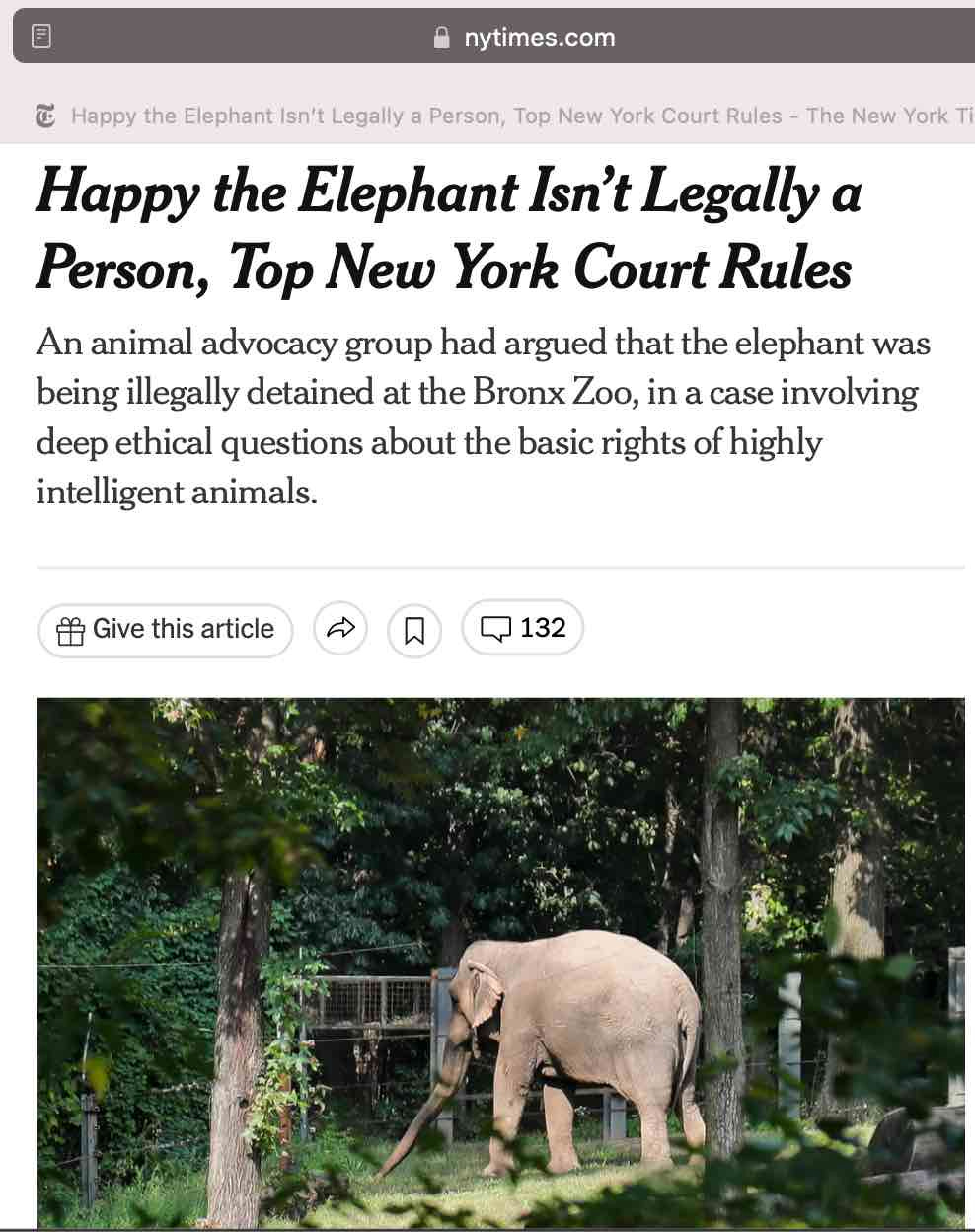 Another case in point: A human rights group called the Nonhuman Rights Group recently sued the Bronx Zoo for its unlawful detention of Happy the Elephant. According to the NRG, elephants are legal persons and have the right of habeas corpus. Though the NRG lost its lawsuit, the courts took it seriously, and legal scholars are increasingly open to animals having “human rights.”