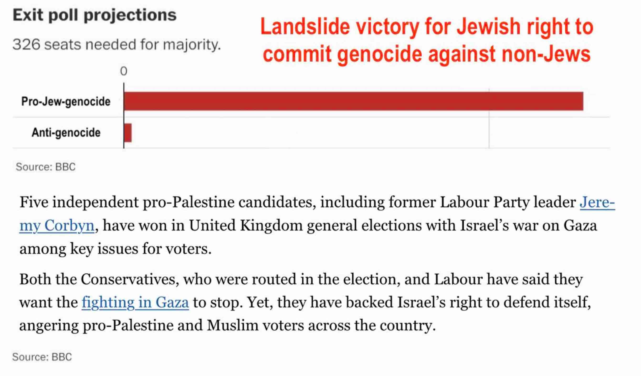 There are only five winning anti-genocide candidates, but one of them was Jeremy Corbyn. So he's back, but he would be the prime minister if it weren't for the Jewish oligarchs.