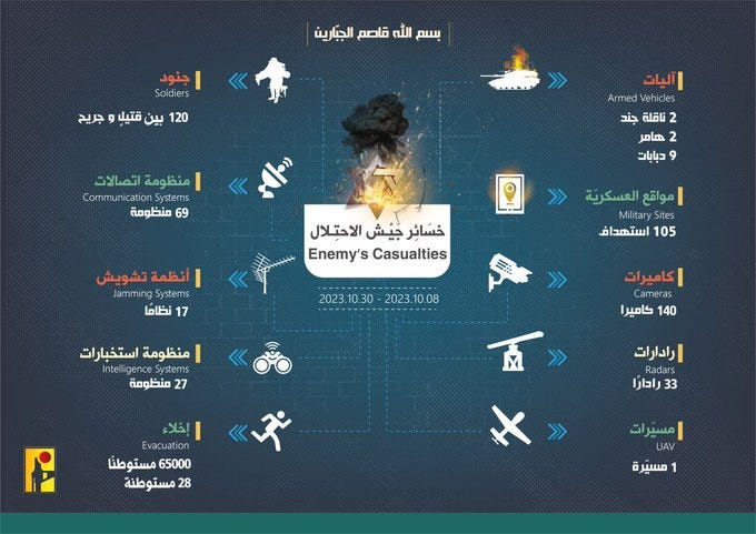 The Lebanese Resistance has just published this graph which indicates the losses inflicted on the occupier between October 8 and 30 “as part of operations on the road to the liberation of Al-Quds”: 120 Israeli soldiers were killed or injured, 65,000 settlers were evacuated from 28 settlements, 13 armed vehicles were destroyed (2 armored personnel carriers, 2 Humvees and 9 tanks) and 105 military sites were targeted. In addition, 69 communications systems, 17 jamming systems and 27 intelligence systems, 140 cameras, 33 radars and 1 drone were destroyed, so that Israel is almost completely blinded to what is happening on the Lebanese border, which would facilitate a major ground offensive from Lebanon. For its part, Hezbollah announced 49 martyrs so far: these are indeed low-intensity clashes, but on both sides, the losses in soldiers already represent almost a third of those of the entire July 2006 war, which is far from insignificant. Especially since this daily pressure on the occupier does not only represent moral support, but indeed military support. As Sheikh Naïm Qassem, Deputy Secretary General of Hezbollah, declared, Israel has amassed 5 brigades around Gaza, and 3 brigades on the Lebanese border: without the threat that Hezbollah poses to Israel, 8 brigades would be amassed around Gaza. It is therefore above all a matter of dividing the enemy's forces, and of leaving its command in uncertainty, in order to paralyze its decision and its willingness to massively commit its forces against the Palestinian Resistance. In this regard, the success is undeniable: to be convinced of this, one only needs to listen to the confused and contradictory declarations of Netanyahu, his ministers and the Israeli general staff on the launch of the ground operation, its timing, its scale, its objectives, etc.