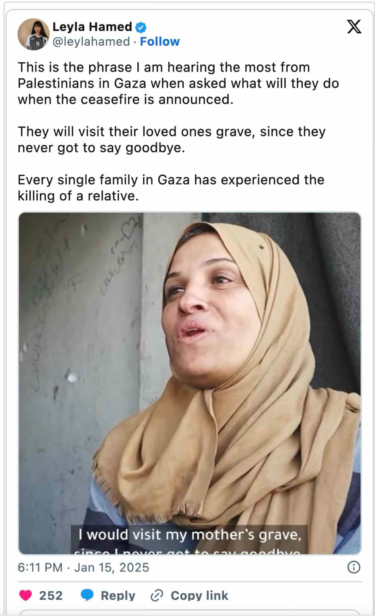 Basically every family in Gaza has experienced the killing of a relative. And so the first thing they're going to do is visit their graves, or in some cases get them decently buried. Israel ought to know that having everybody in Gaza having lost a relative, didn't win them any long-term friends, did it?