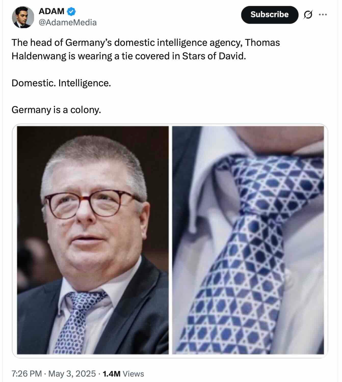 Thomas Haldenwang, head of Germany’s domestic intelligence service BfV, has been raising eyebrows by appearing in public wearing a tie covered with Stars of David, the Israeli national symbol. Some observers have interpreted Haldenwang’s sartorial chutzpah as a gesture of solidarity with Israel’s “right to rape” movement.