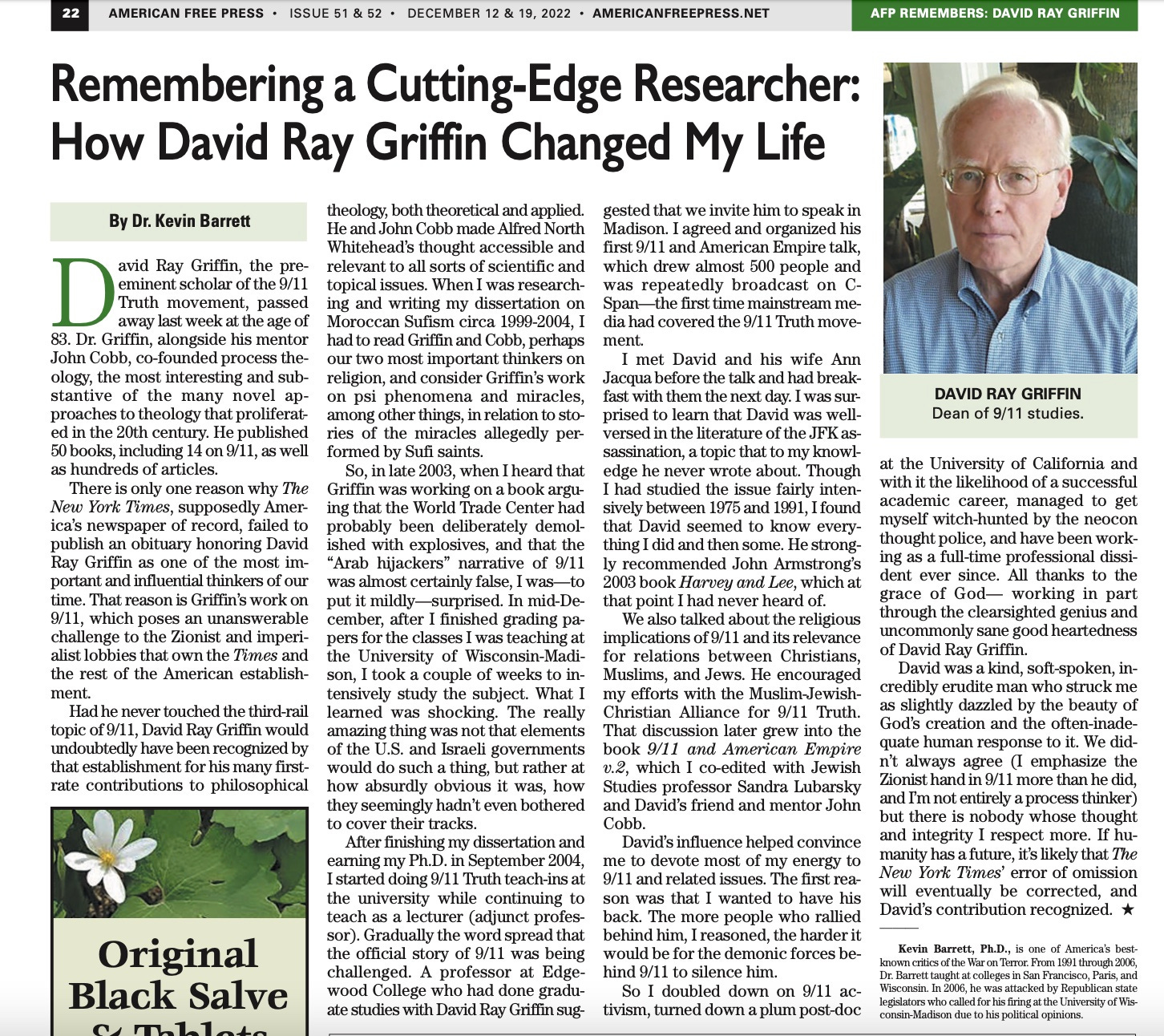 There is only one reason why The New York Times, supposedly America’s newspaper of record, failed to publish an obituary honoring David Ray Griffin as one of the most important and influential thinkers of our time. That reason is Griffin’s work on 9/11, which poses an unanswerable challenge to the Zionist and imperialist lobbies that own the Times and the rest of the American establishment.