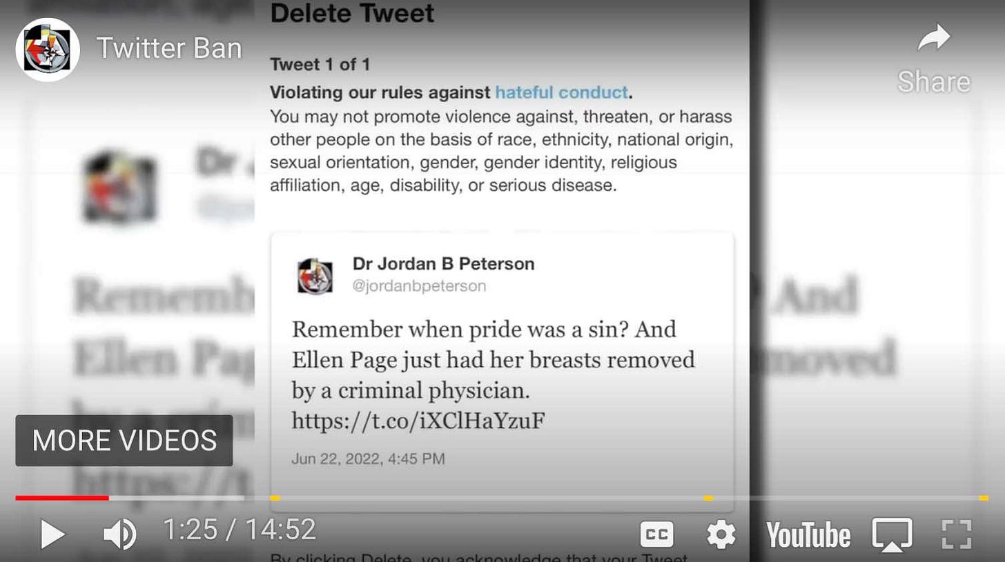 Mainstream media won’t repost the “hateful tweet,” which makes it hard for readers to understand what got banned and why. So I found Peterson’s pushback video which includes a shot of the tweet and the rules it supposedly violated.