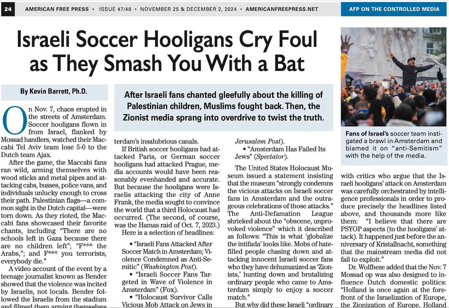 Dutch scholar and author Alexander Wolfheze, who was in Amsterdam on November 7, describes the event as a “psy-op.” In a November 12 interview with this author Wolfheze agreed with critics who argue that the Israeli hooligans’ attack on Amsterdam was carefully orchestrated by intelligence professionals in order to produce precisely the headlines listed above, and thousands more like them: “I believe that there are PSYOP aspects (to the hooligans’ attack). It happened just before the anniversary of Kristallnacht, something that the mainstream media did not fail to exploit.”