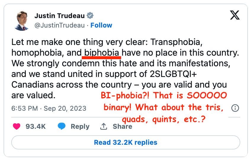 Justin Trudeau screwed up big-time. His attack on the Muslim-led 1 Million March 4 Children may have been a deliberate insult to Muslims and their moral standards—but who cares about that? The real problem: Trudeau accidentally dissed non-binary people! By saying Canada only stands against transphobes, homophobes, and biphobes, Trudeau snubbed the 105 genders other than old fashioned vanilla male and female. (Transexuals transition between the two vanilla genders, homosexuals are attracted to one of the two vanilla genders—namely, the wrong one—and bisexuals like to fornicate with people of both of the two vanilla genders—which, as Woody Allen said, doubles their chances of getting a date…chances that can be further improved by declaring adopted teenage stepdaughters fair game.)