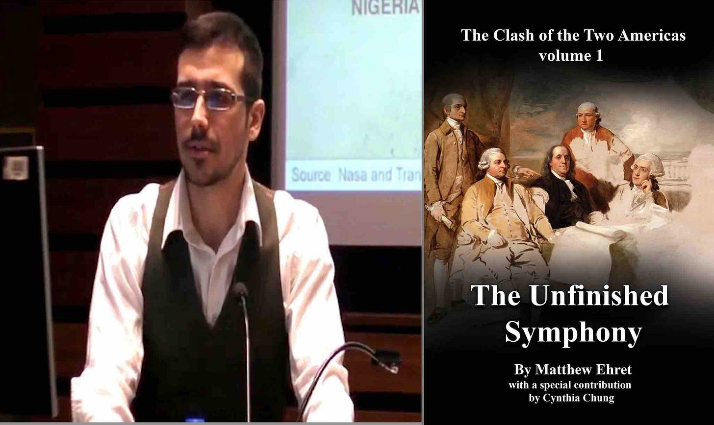 In the book, Ehret identifies his two Americans with two long-standing schools of thought: “The idea of a society founded upon the cultivation of the love of higher pleasures of the spirit rather than the feeding of the lower pleasures of the fleshly passions…” Ehret and Chung see the same philosophical clash playing out in the Revolutionary and Civil War eras and leading up to the populist vs. international banker clashes of the late 19th and early 20th centuries.