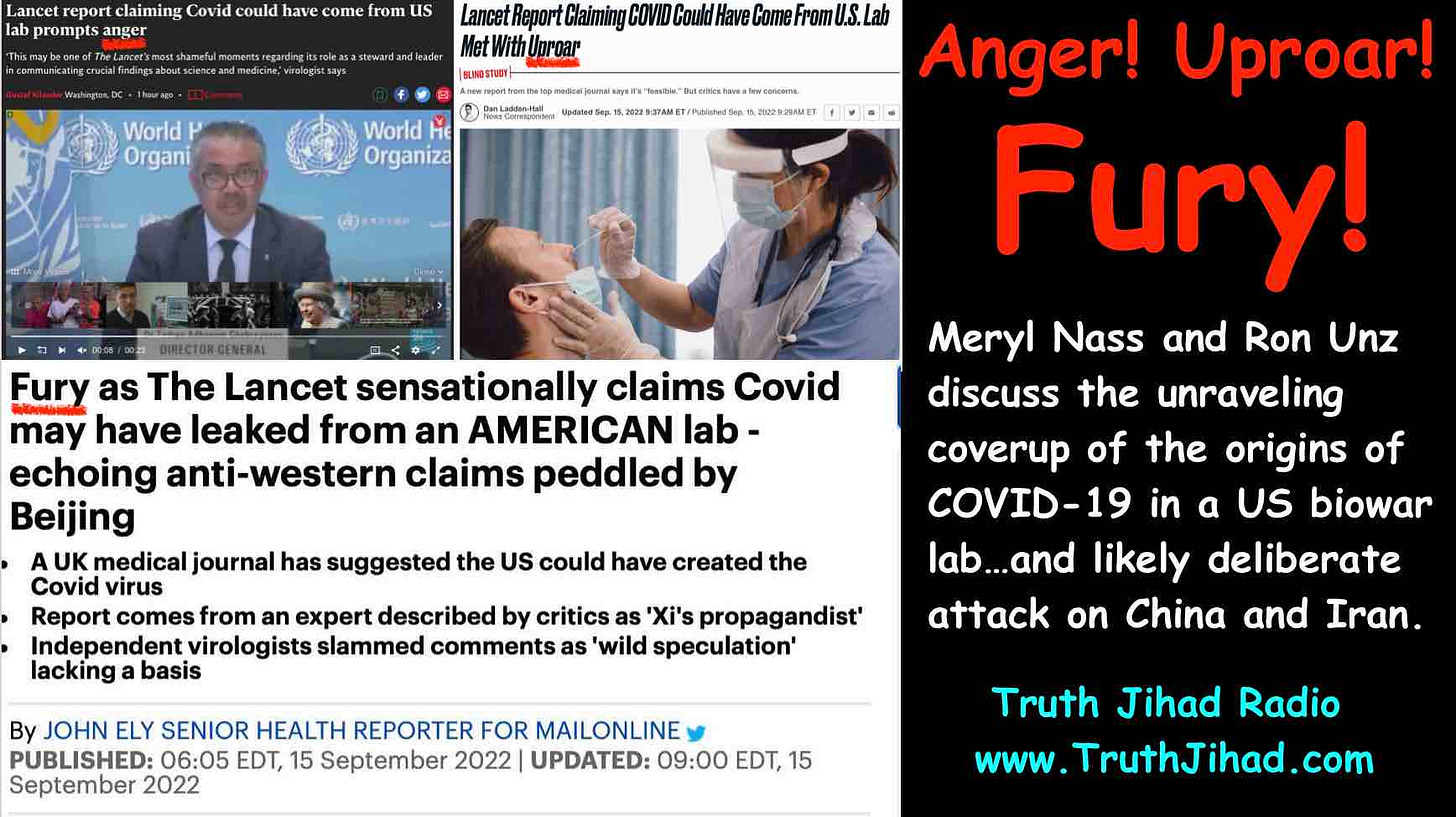 Second half-hour: Ron Unz says the alternative media are “politically bankrupt” because they won’t cover evidence for the likely origin of the COVID-19 pandemic in a (rogue) US biological attack on China and Iran. He’s obviously not talking about Truth Jihad Radio!