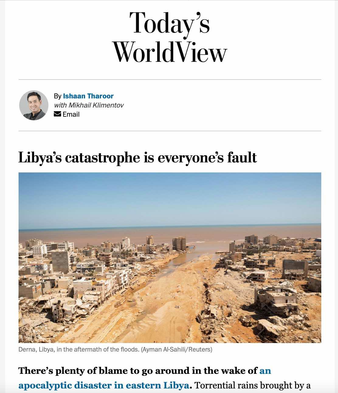 And speaking of disasters, get a load of today’s Washington Post. They are telling us with a straight face that “Libya’s catastrophe is everyone’s fault.” In other words, it’s not NATO’s fault for waging a war of aggression, overthrowing Libya’s government, murdering its leader, and destroying Libyan society, leading to the horrific neglect of the generally admirable infrastructure built by Muammar Gaddafi.