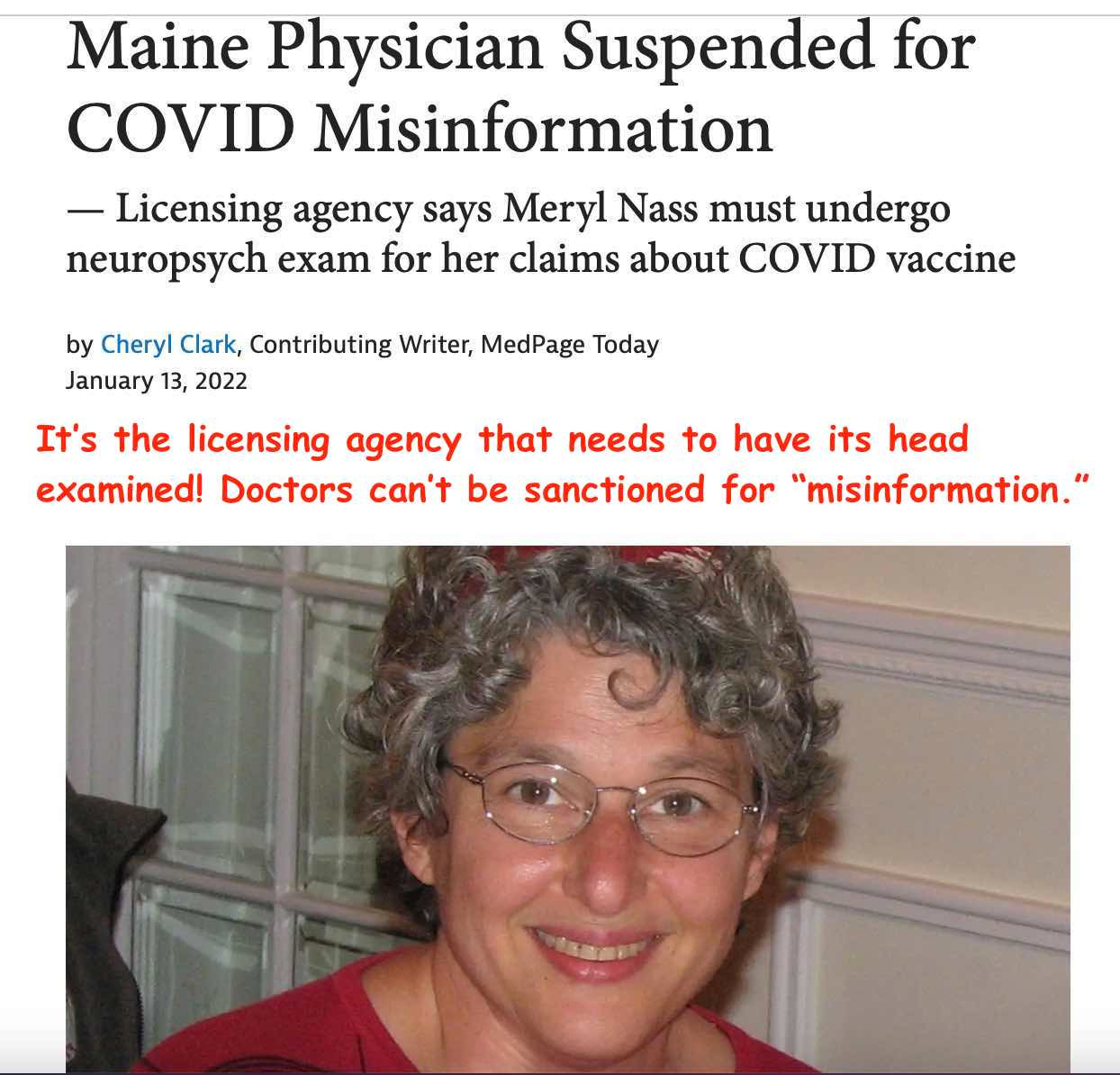 Dr. Nass, a published expert on biological warfare, has been subjected to a barrage of specious and often incoherent attacks since she began questioning various aspects of the COVID pandemic/response. The original campaign to pull her medical license charged her with spreading misinformation. But since misinformation is often in the eye of the beholder, and more importantly since there is no provision for pulling medical licenses on such grounds, her persecutors dropped that absurd charge and instead went after her for prescribing ivermectin and hydroxychloroquine to COVID patients, just like tens of thousands of other doctors around the world have. (Ivermectin has been used by almost a third of the world’s population, meaning more than two billion people.)