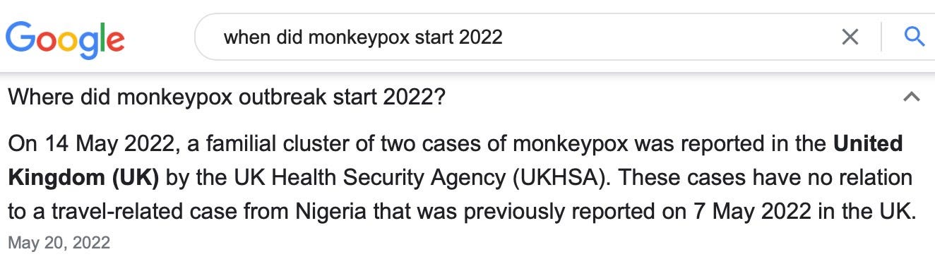 Google, the ultimate arbiter of truth about everything, tells us the real-world monkeypox epidemic began on May 14, 2022: