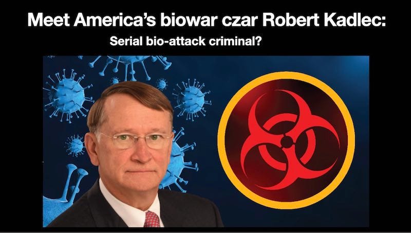 Webb notes that Robert Kadlec ran the Dark Winter exercise that prefigured the anthrax attack, and also served as top Pentagon bioterror advisor during the run-up to the attack. Kadlec’s checkered career raises the question: If it takes chutzpah to attack your own people, and the world, with biological weapons, how much more chutzpah does it take to do it repeatedly as an undisguised serial biowar criminal, bailing out your failing companies, one after another, by unleashing plagues on the public?