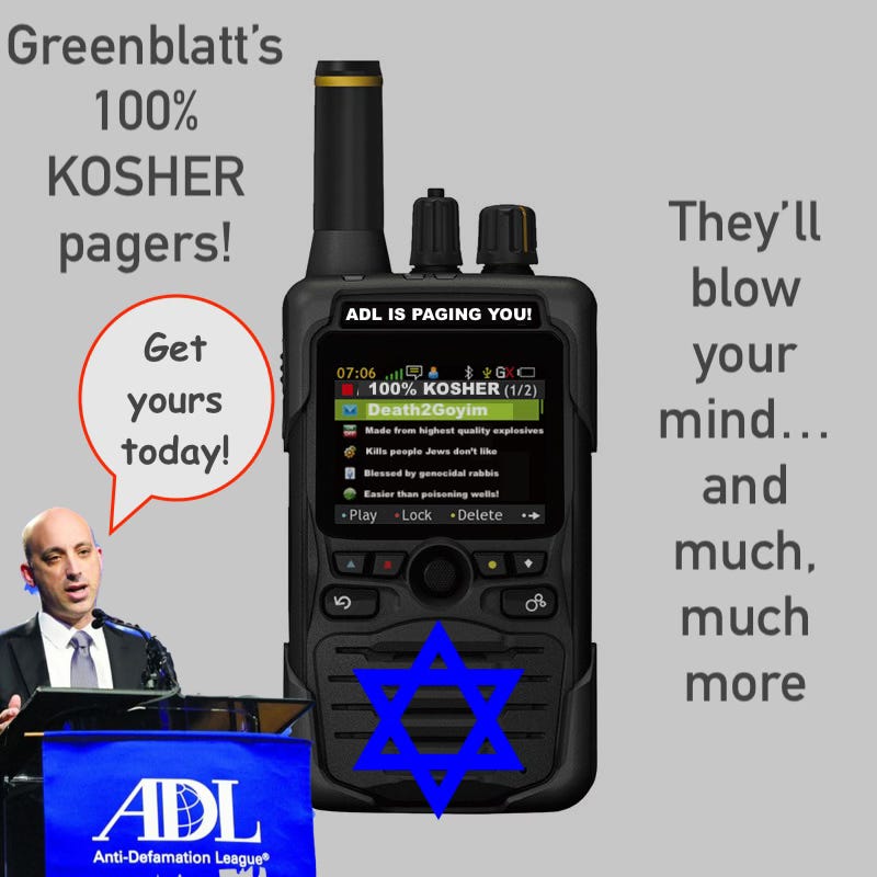 ADL head Jonathan Greenblatt has announced a plan to capitalize on the explosive growth of antisemitism by selling a new line of pagers specifically designed for people Jews don’t like. The pagers will be 100% kosher, blessed by genocidal rabbis, and distributed to the billions of people around the world who frown on genocide.