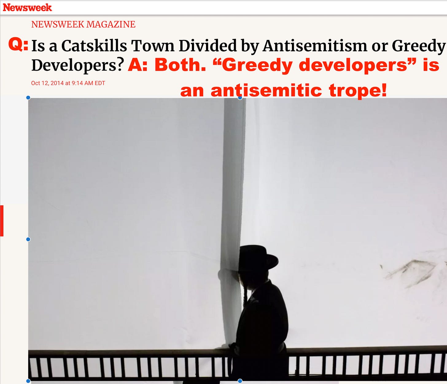 And so that leads to our quiz question. “Is a Catskills town divided by anti-Semitism or greedy developers?” And the answer is: “Both A and B. Greedy developers is an anti-Semitic trope.”