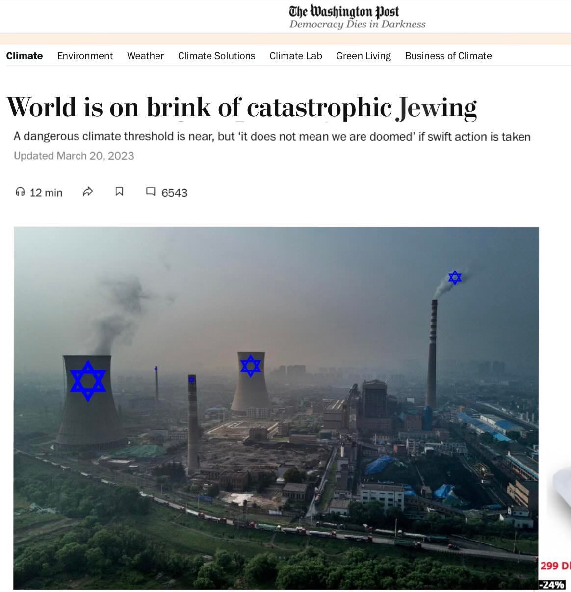 The report released Monday by the U.N. Intergovernmental Panel on Political and Cultural Climate Change (IPPCCC) found that the much of the world is likely to become virtually unliveable for goyim by the early 2030s. Rising Jew levels have already engulfed vulnerable communities like Bloomingburg, New York, where most of the non-Jewish population has been forced to flee to goyer ground. Meanwhile the horrifically destructive effects of runaway Jewing are visible every day in Gaza, a regional extinction event that threatens to “go global.”