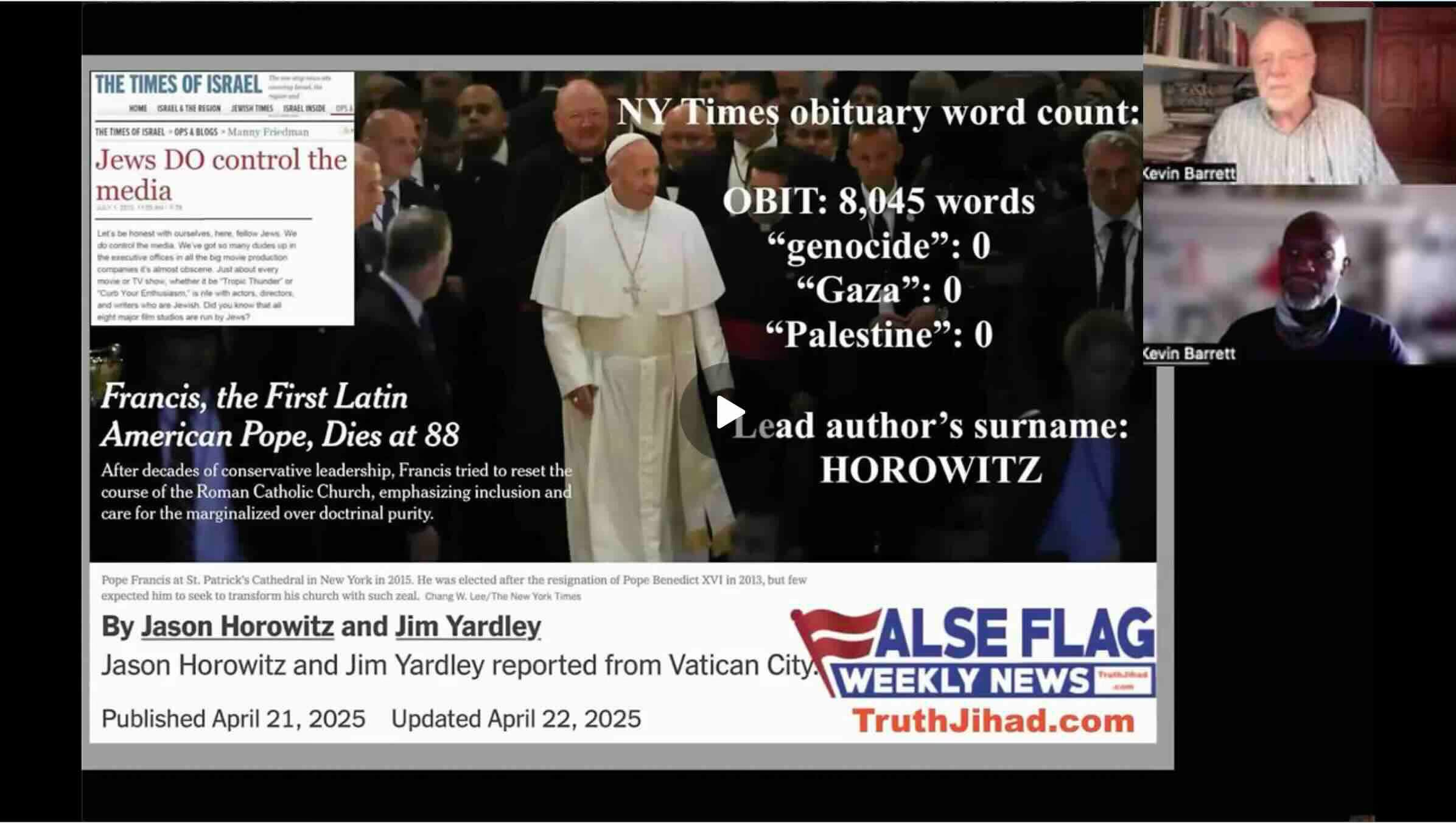 As my False Flag Weekly News co-host and professional journalist Kevin Barrett Bilali put it, the Times’ failure to mention the Pope’s anti-genocide efforts even once in an 8000-word obituary amounts to “journalistic malpractice.” I would go one step further and say that this particular case of malpractice constitutes a vastly worse crime: complicity in genocide. Since genocide is the worst crime humans can commit, far worse than mere terrorism,* all measures applied to terrorists and terrorist organizations ought to be applied, albeit much more severely, to The New York Times and all of its backers and personnel.