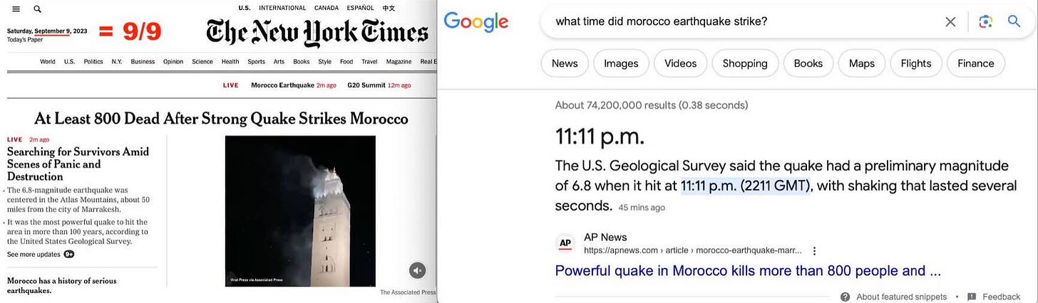 In what struck me as a disturbing coincidence, the quake struck last night at 11:11 pm, just in time for the 9/9 newspaper headlines, two days before the 22nd anniversary of “9/11.”