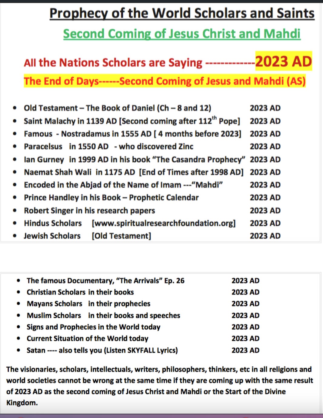On December 17 I discussed the end times (akhir uz-zamaan) with Islamic Scholars Jowad al-Ansari and Alamdar Zaidi and Convert Andrew Israel. Tonight I will be talking to Robert Singer, #9 below in the list of thinkers who are saying the “end” is 2023: