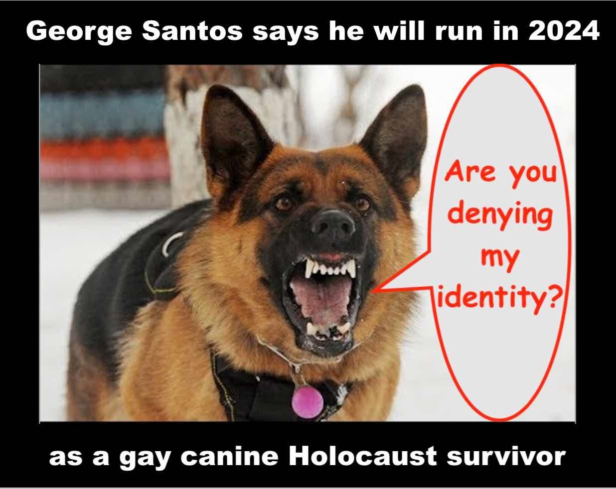 Santos insisted that not only would he not resign, but that he was already planning an even more mendacious—or, as he put it, “identity politics based”—campaign in 2024. “Next time around, I’m running for Congress as a German Shepherd, and if you don’t like it, I’ll bite you on the ass.”