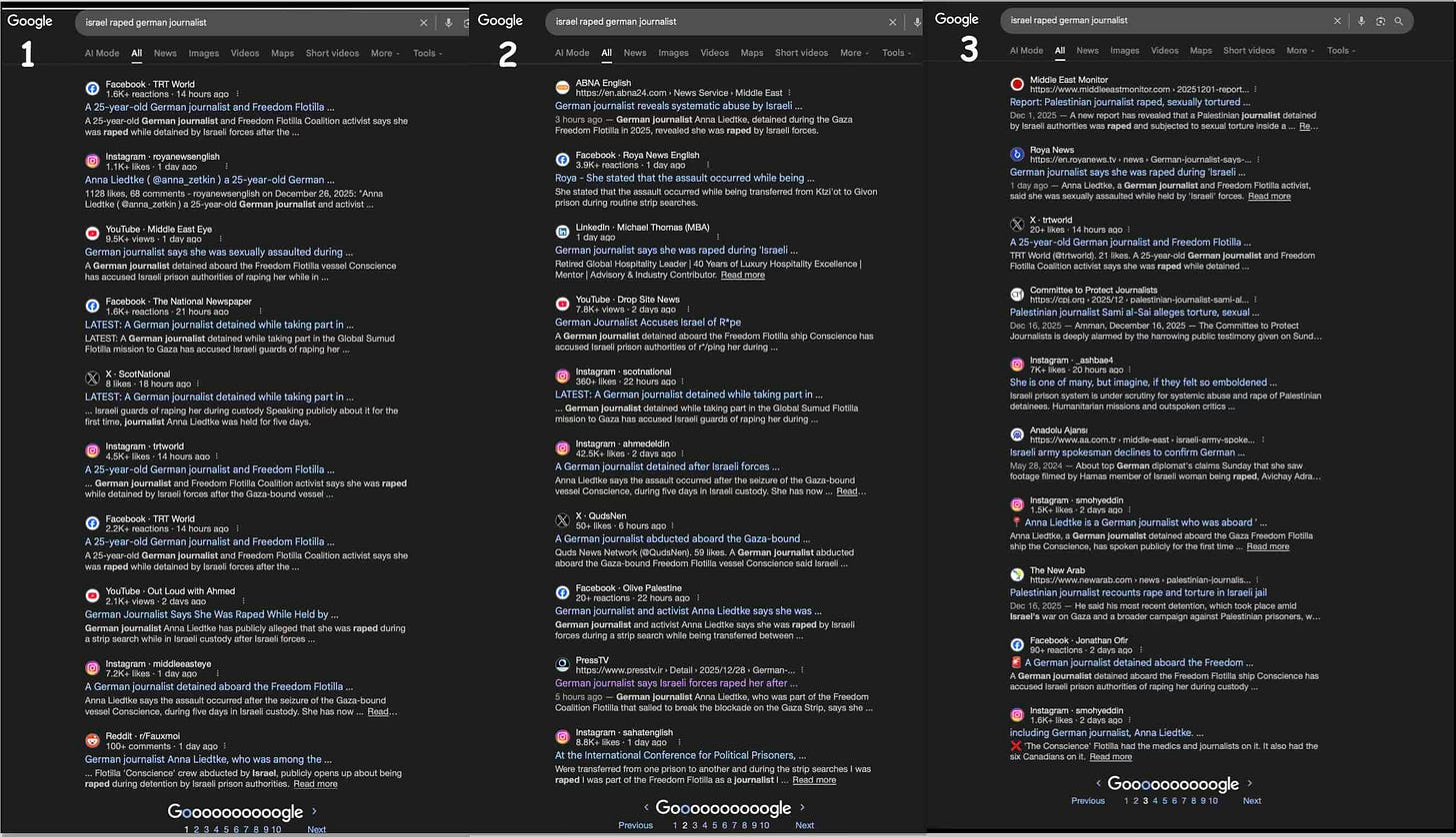 Last week German journalist Anna Liedtke spoke publicly for the first time about being raped by Israeli soldiers after being kidnapped in international waters in September. If Iran or Venezuela or Russia had kidnapped activists, viciously abused them, and even raped one or more of them, it would have been front page mainstream media headlines for weeks…especially if one of the victims was one of the world’s biggest celebrities. And if Germany had kidnapped a ship full of Jewish activists…well, let’s not even go there. So let’s Google “Israel raped German journalist” to find some of that heavy media coverage.