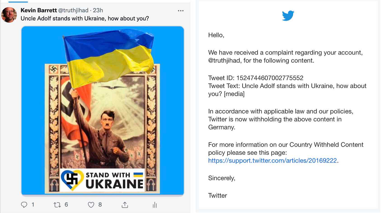 Twitter sent me an email last night explaining that my tweet "Uncle Adolf stands with Ukraine, how about you?" is illegal in Germany.