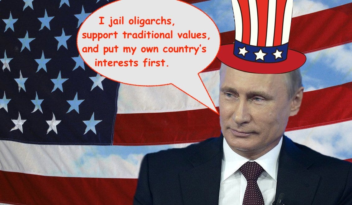 What would an “American Putin”—a brave and competent leader who put the interests of ordinary Americans first—do? Like Putin, he would focus on defending his nation’s borders. He would forget about policing the world. He would whip the oligarchs into submission. He would encourage a long-term effort to restore traditional spiritual and religious values. He would rebuild our economy and infrastructure. He would have the nation stockpile gold to back its currency. He would refuse to let Israel completely control our Middle East policy. He would tell the New World Order to go to hell.