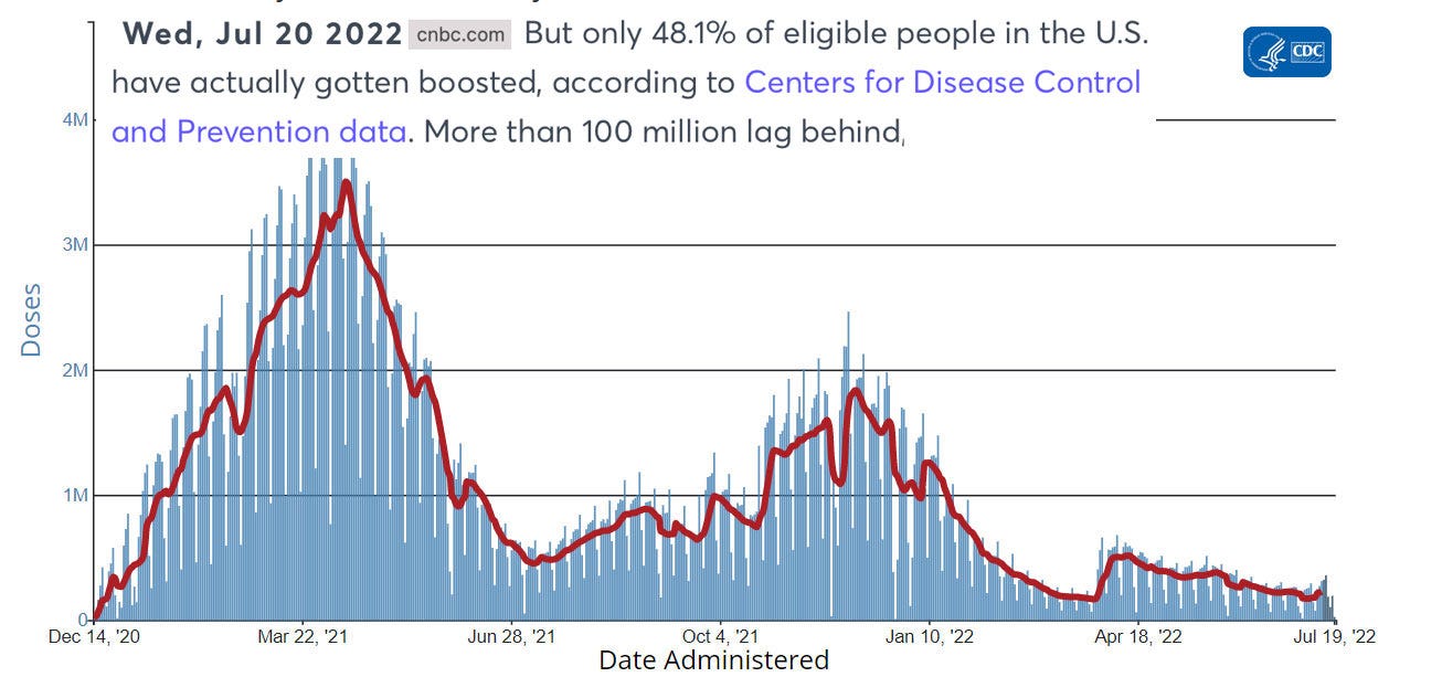 The CDC graph of daily vaccine uptake shows that it peaked in late March 2021 at around 3.5 million doses per day and then sharply declined. In winter 2021-2022 it rose to about half that level, 1.8 million doses per day, then steeply declined again. Since then it has remained very low, averaging well under half a million doses per day.