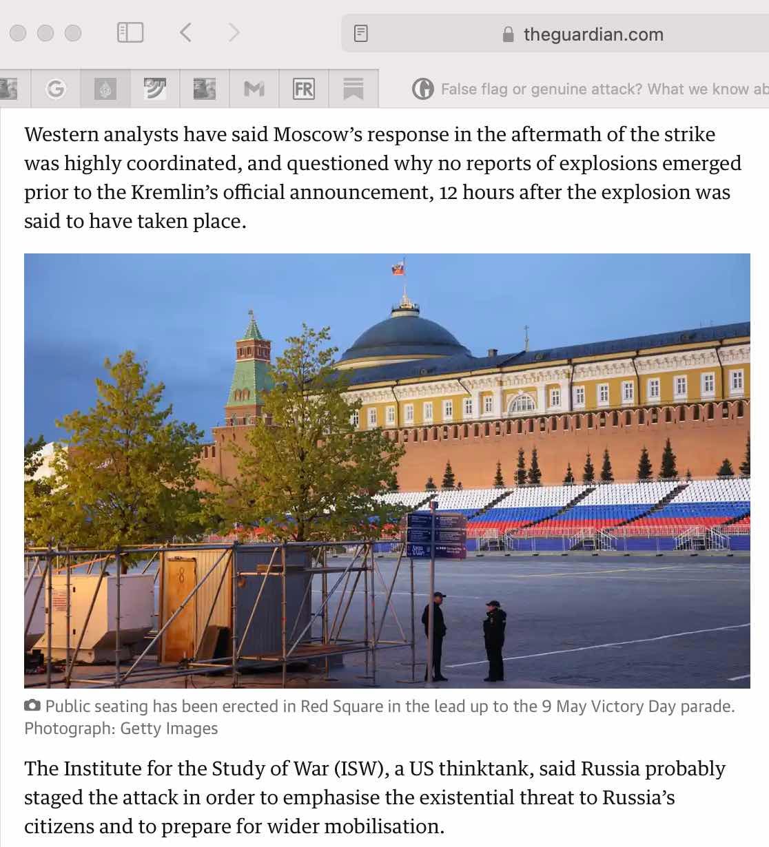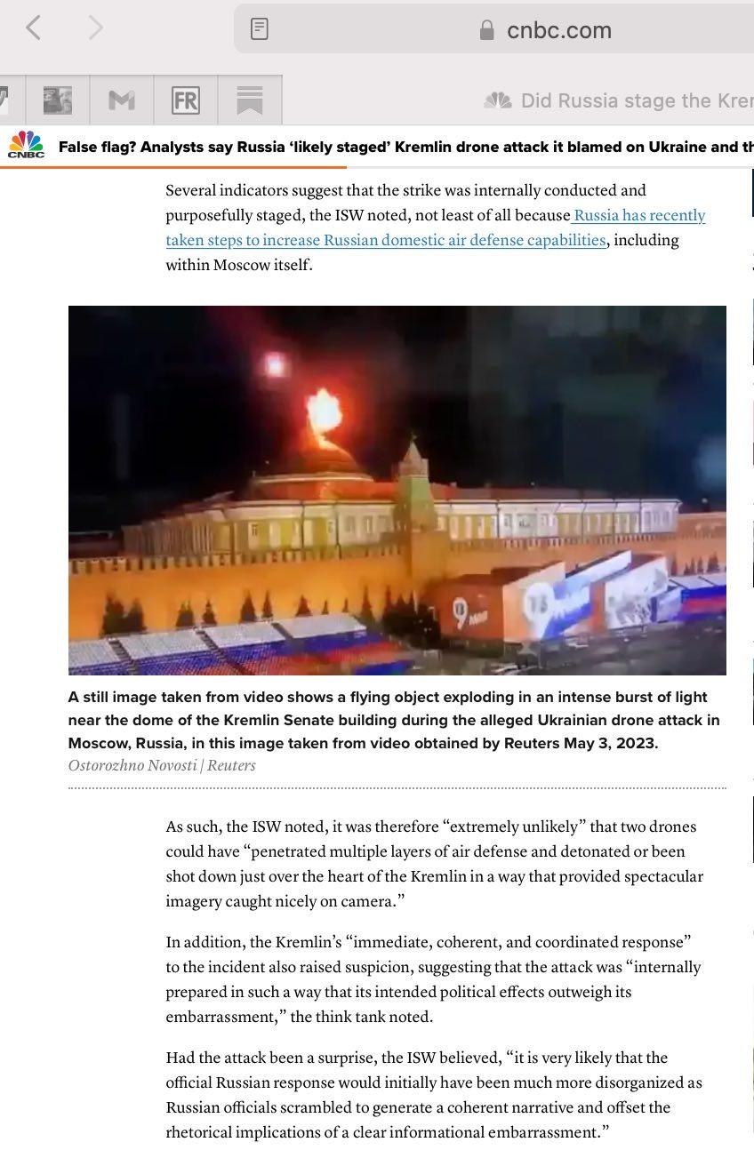 This was the biggest False Flag Weekly News Story this week, but I’ve been saving it for last. Among the really dumb things we are supposed to believe is that now that the 9/11 truthers have succeeded in pushing the expression false flag into everyday parlance, we should just settle down and believe that only the dastardly Vladamir Putin ever does such things. Following the May 3 drone attack on the Kremlin, the empire’s media went into full conspiracy theory mode.