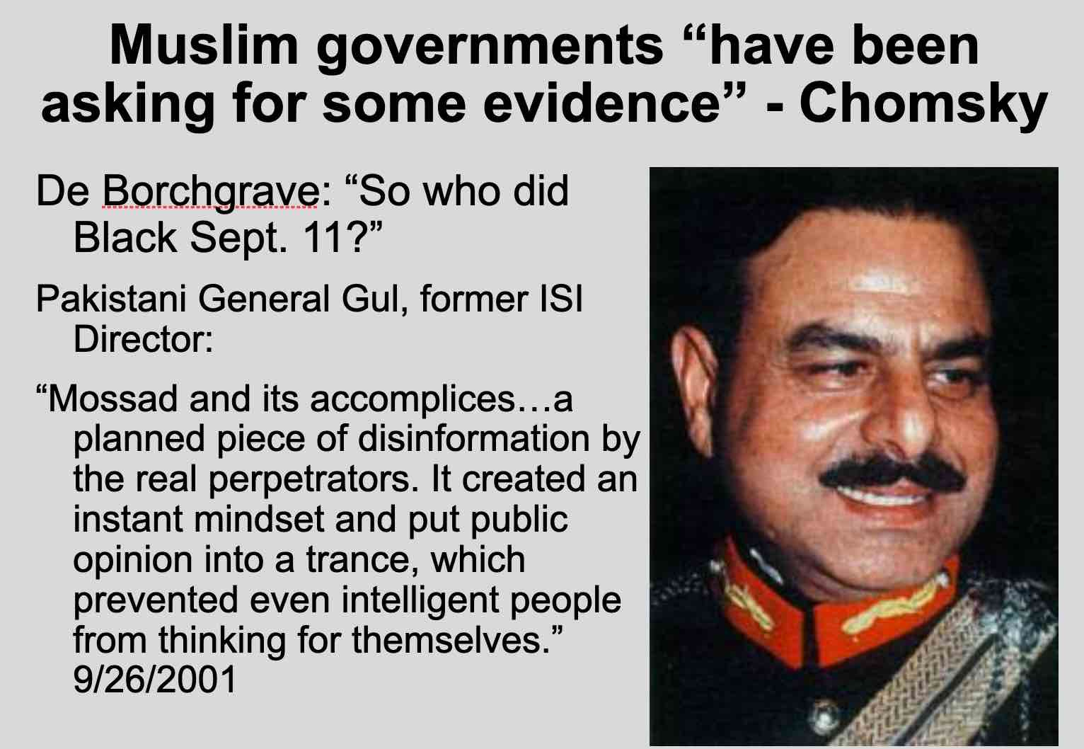 Heikal isn't the only very, very high level Muslim government person pointing this out. We have General Gul, who just recently passed away, the former ISI director in Pakistan, who gave this very early interview in September 2001, in which he pointed out that Mossad and its accomplices—and he said specifically people in the US Air Force—did 9/11. And this is not a secret in Pakistan. A World Public Opinion poll shows that in Pakistan, only 3% of Pakistanis believe the official story that Arab hijackers were responsible for 9/11. 3%! The other 97% doesn't believe it.