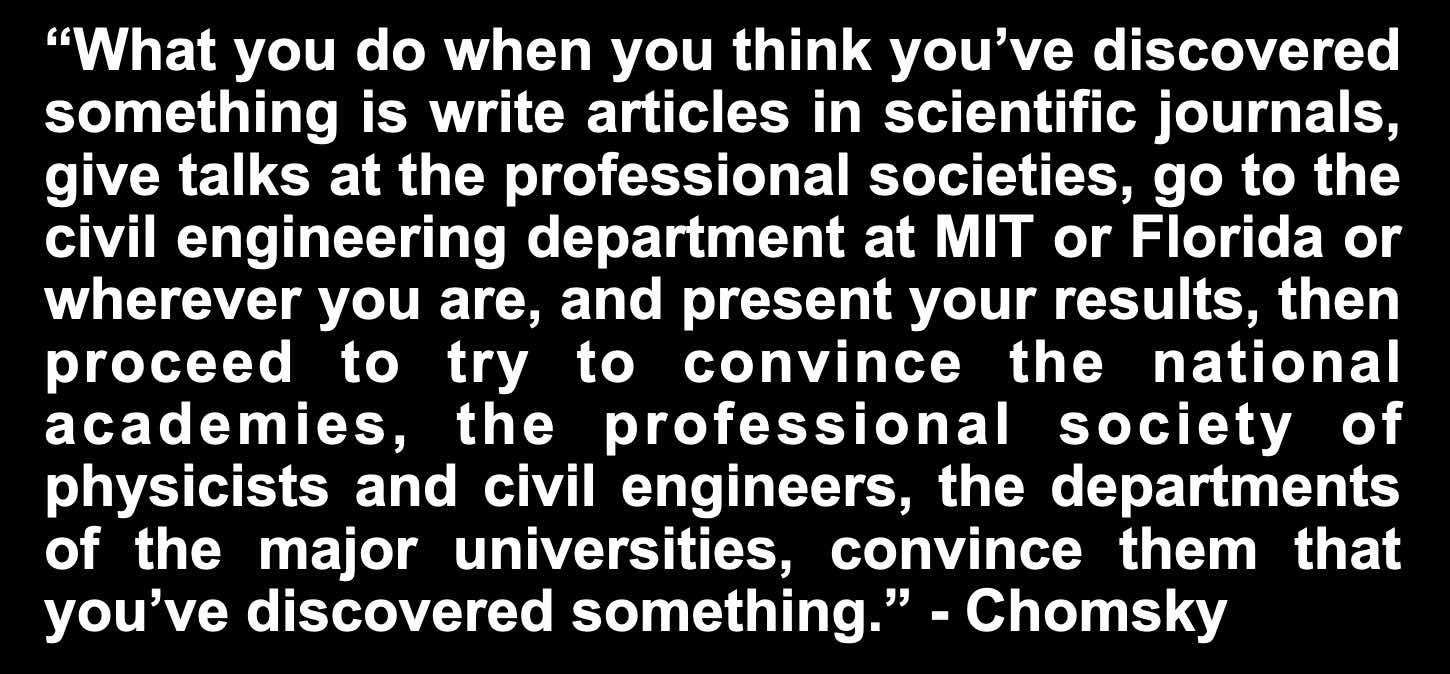 Chomsky feeds us a line of BS that when you think you've discovered something, you must go through the scientific journals and publish it, peer reviewed, blah, blah, blah, blah, blah. Even if it's something that a third grade science student can see if they have eyes. Okay. And of course, we have more than 30 peer reviewed science 9/11 truth papers today. There are a lot of them. It just it takes years to to get through the peer review process. But the real point here is, as we see in the next slide, that what we're talking about here isn't really a scientific dispute. We're talking about people who are putting forth wings-on-pig narratives.