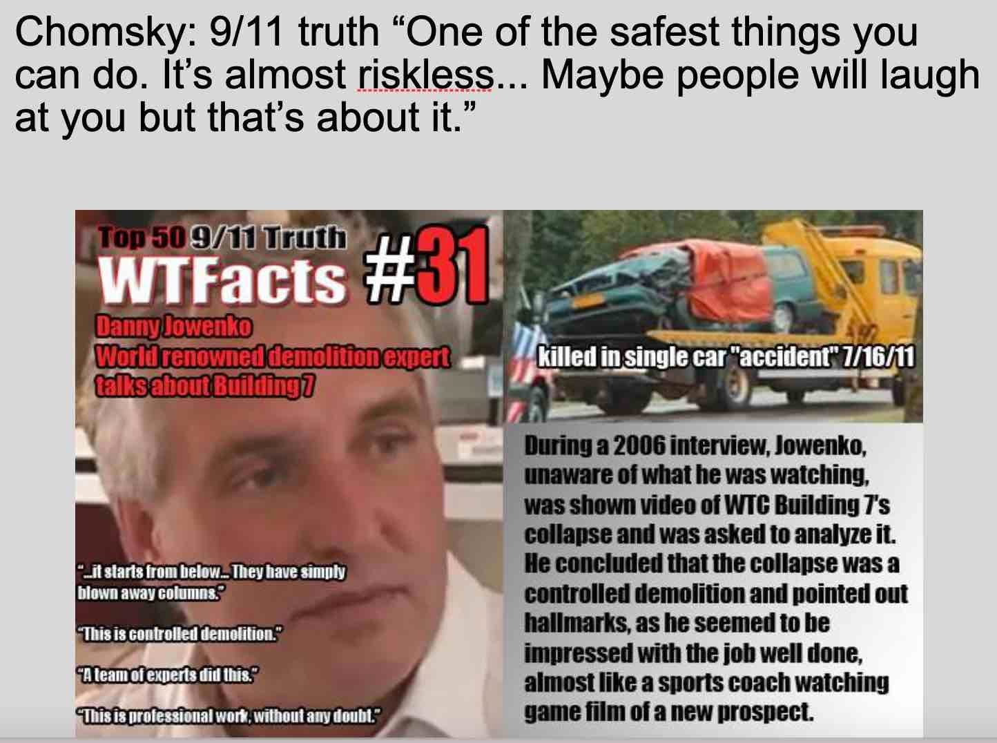 Chomsky tells us that it's very, very safe to question 9/11. It's risk-free. And the worst thing that could ever happen is people will laugh at you. Well, tell that to Danny Jowenko, Europe's leading controlled demolition specialist, who was caught by surprise, saying, "of course Building Seven is obvious controlled demolition. This was a really amazingly proficient team of engineers that did this. Look at how it comes straight down, straight into the ground. You know, this isn't just a controlled demolition. This is a really, really good one." And then he ends up dying in a mysterious single-car crash.