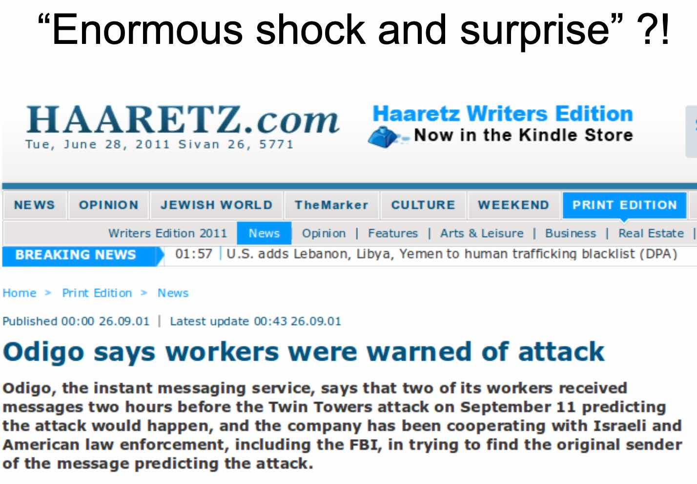 And we had the Odigo instant messaging service warning that went out a couple of hours before the attacks in Hebrew, telling this Israeli based company's messaging system audience to stay out of lower Manhattan. And this is from Haaretz. It's not some kind of anti-Semitic rumor or something. It's a legitimate news story from Haaretz.