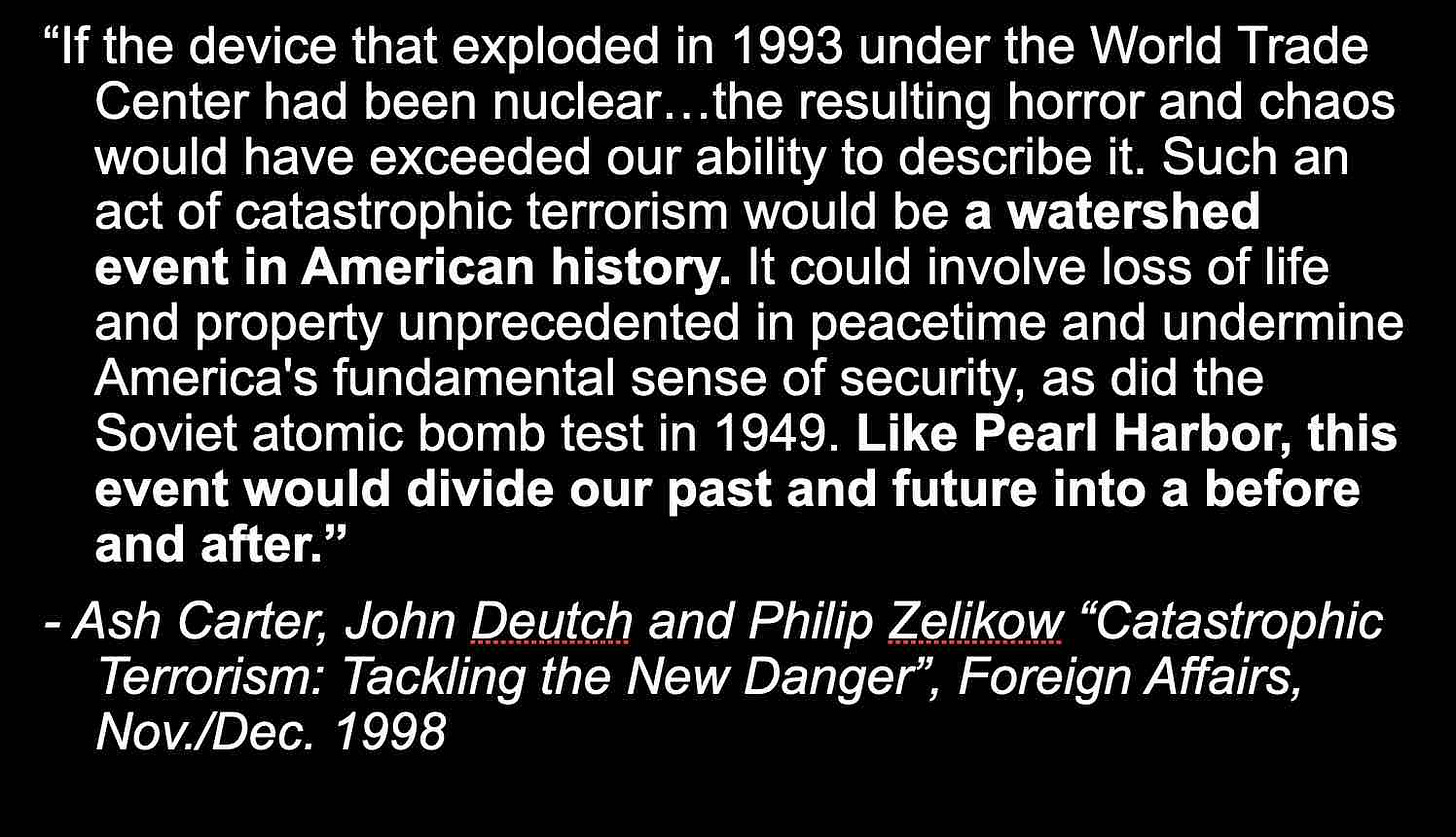 This is how foundational myths work. Zelikow knows this. That's his specialty. He's the guy who wrote the entire 9/11 Commission Report in chapter outline before the Commission even convened, as Barbara Honegger said. And here he is in 1998, telling us what's coming: "The World Trade Center is going to be destroyed and it'll separate time into a before and an after."