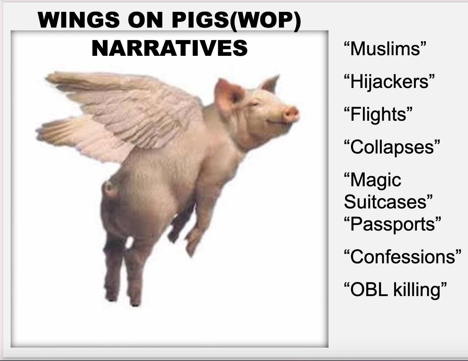What is the official story? "Muslim hijackers hijacked flights that smashed into buildings, causing collapses. And we know this because we found evidence in Mohammad Atta's two magic suitcases that just showed up, along with the KSM torture testimony." That's the whole basis of the story! "We have these passports showing up in the rubble at two of the crash sites. We have these tortured-KSM confessions. And we have this wings-on-pigs narrative of the Osama bin Laden killing." This is a ludicrous fantasy that wouldn't pass muster with the people who are employed to check the realistic elements in Hollywood scripts.