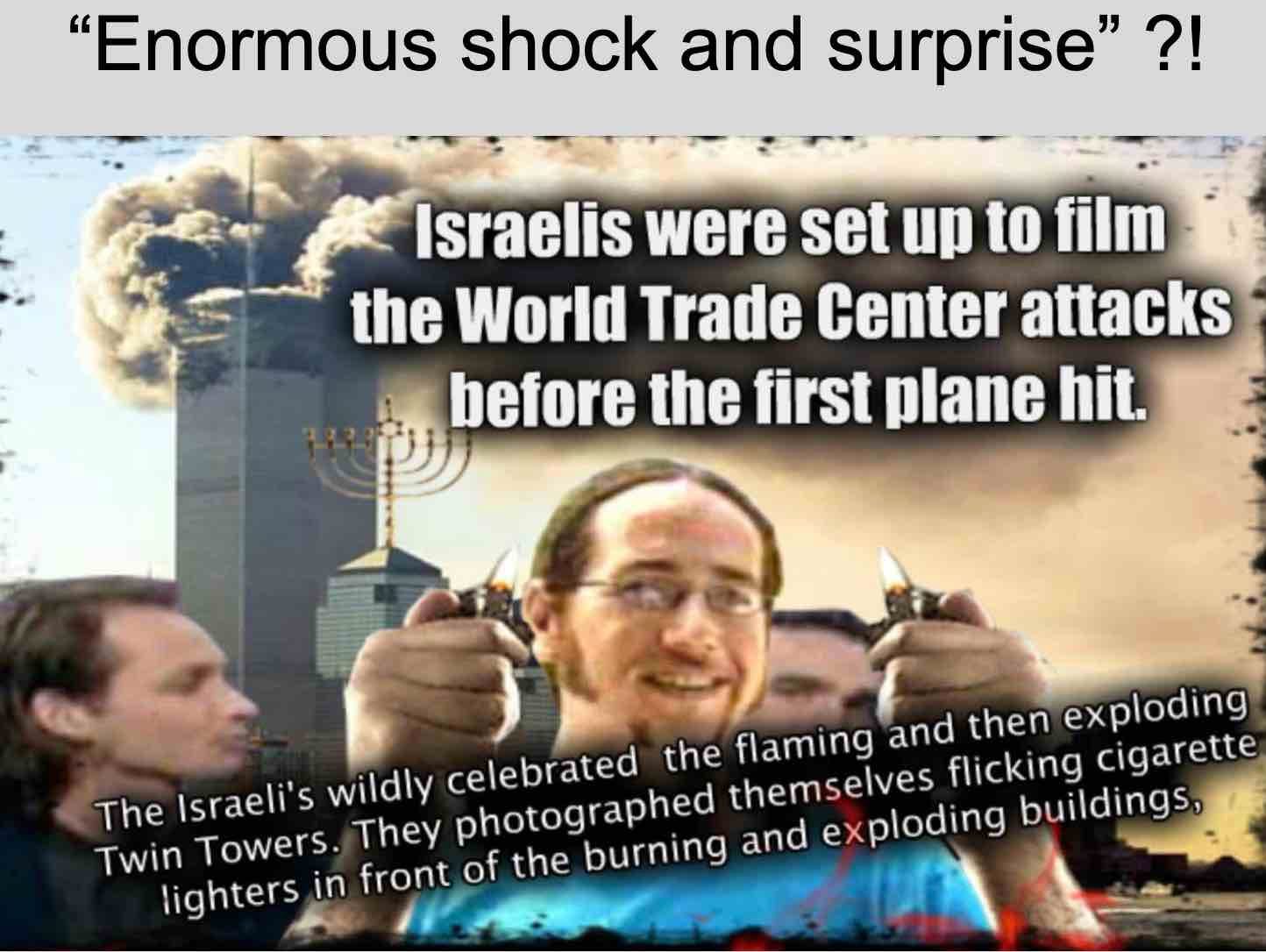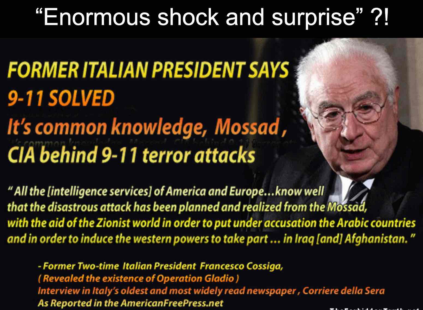 And in terms of shock and surprise to everybody in the intelligence community, we have Francesco Cossiga, the former Italian president, pointing out that "all the intelligence services in the US and Europe know that this attack was planned by the Mossad with the aid of the Zionist world in order to accuse the Arabic countries and launch these wars on Muslim countries." Everybody knows that. There's no shock and surprise.