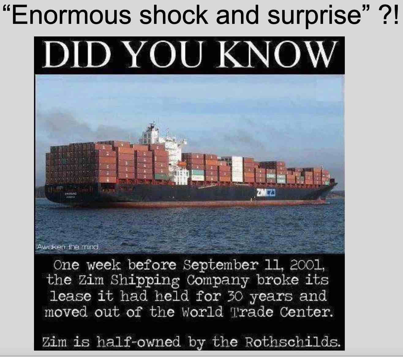 And here we have Zim Shipping Company that's half owned by the state of Israel and the other half by the Rothschilds moving out, breaking its 30 year lease at the World Trade Center. They broke that lease and lost a huge pile of money by moving out very, very quickly one week before 9/11. It certainly didn't come as a huge shock and surprise to them.