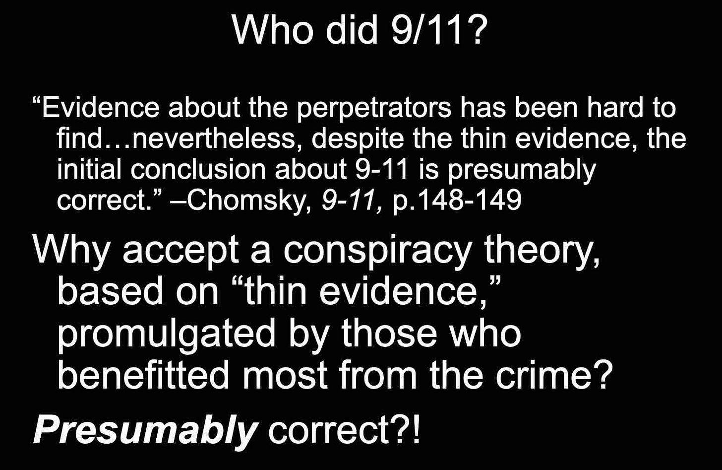 Why would we do that? Why would we accept this official conspiracy theory that's based on "thin evidence," which is an overstatement? "Thin evidence" means there is some evidence. And in fact, there's no convincing evidence that any element of the official story is true. But let's say there's a little bit of very, very thin evidence. Why would we believe that, when the people feeding us this thin evidence are the people who benefit the most from the crime? Why is this "presumably correct"? What has Chomsky been smoking?!