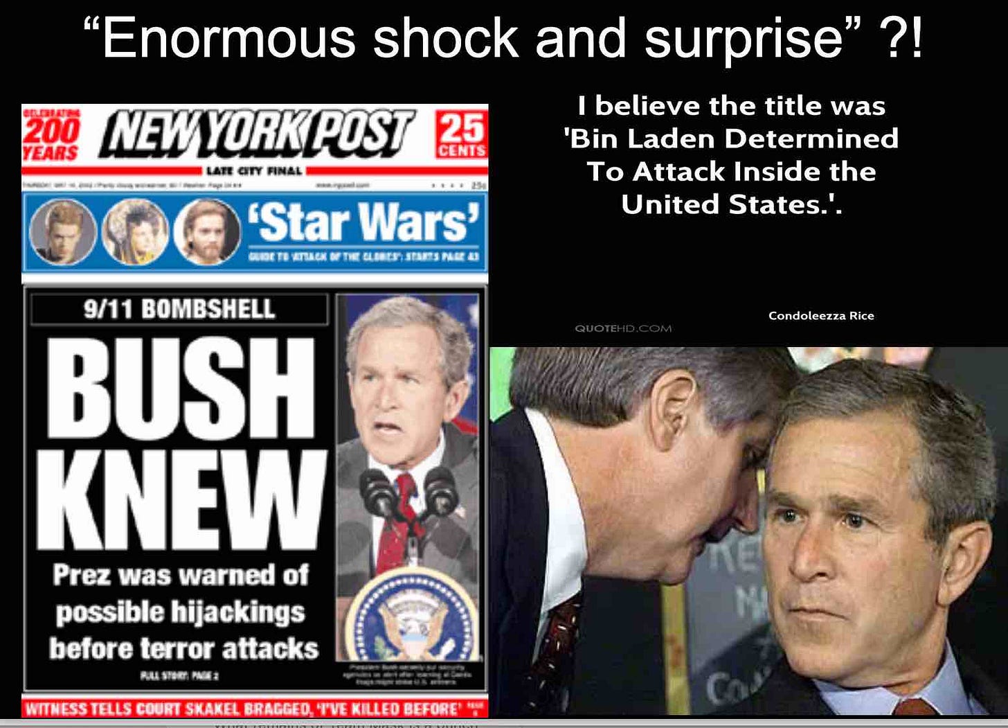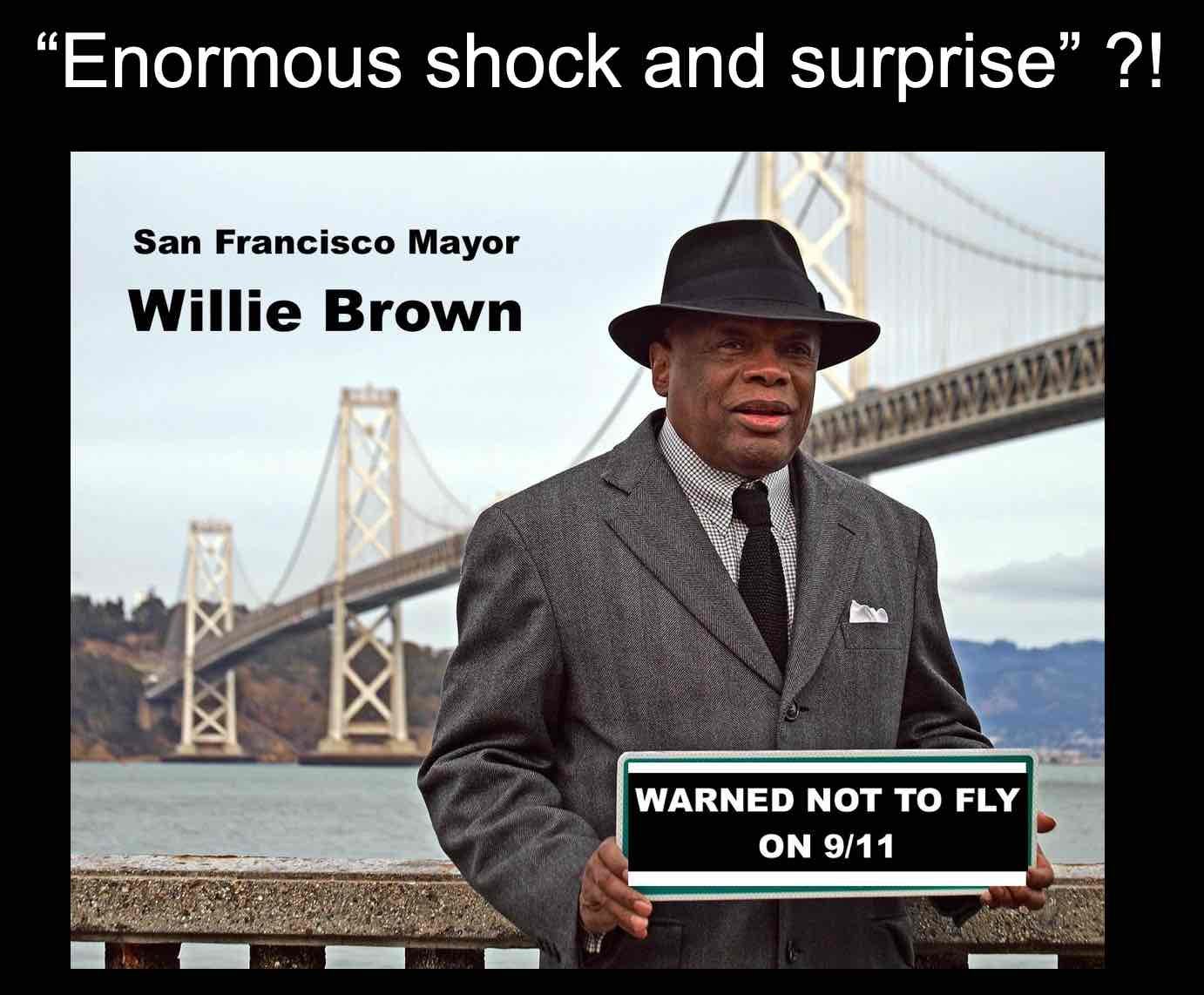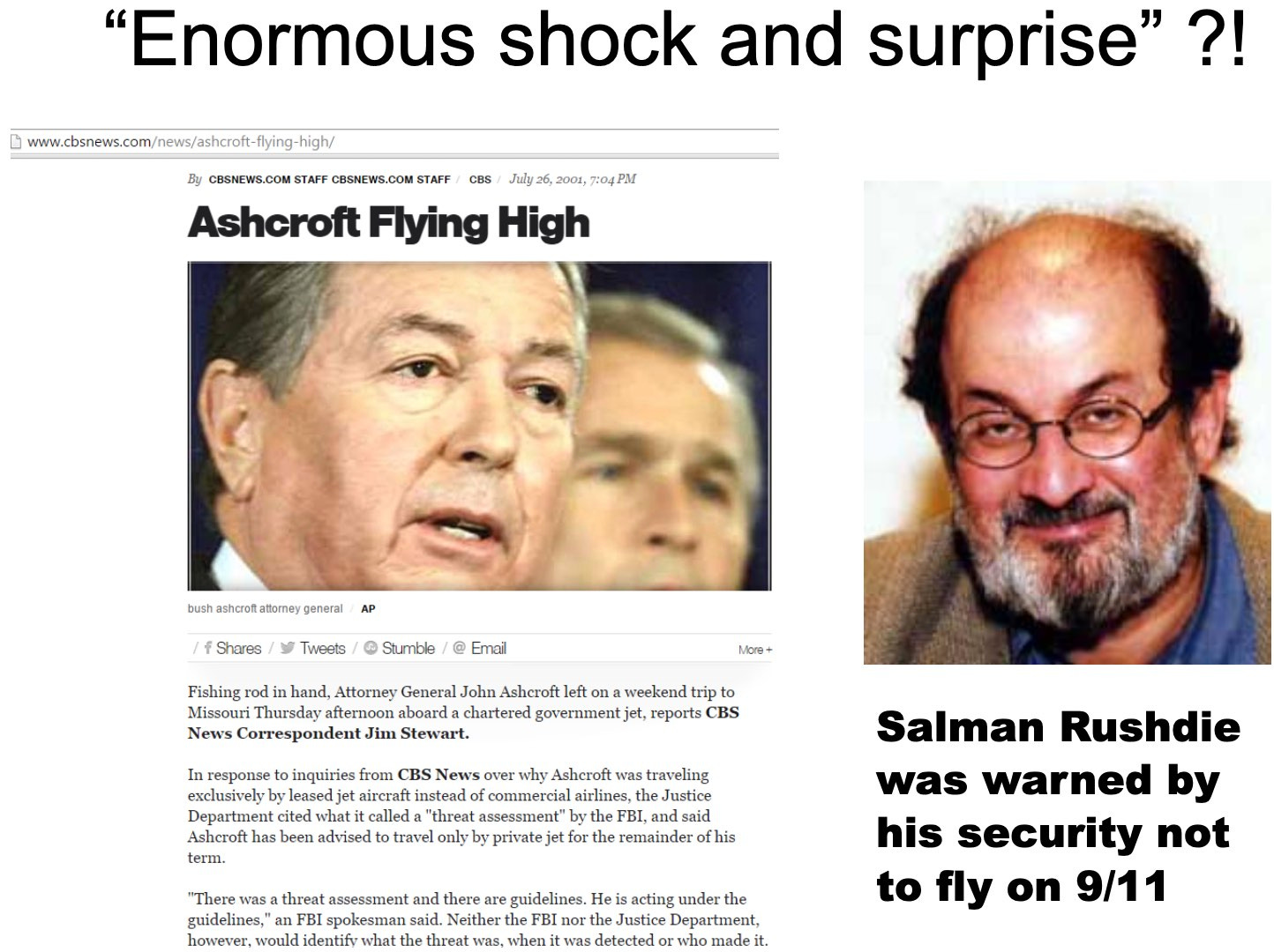 What an enormous "shock and surprise." And then let's not even get into "Bush knew," the "bin Laden determined to attack the United States" briefing that Condoleezza Rice, who was on record saying who "could imagine such a thing," actually had to admit was given to Bush in August of 2001. And Bush snapped angrily at the briefer, "Well, you've covered your ass now." What could that possibly mean, other than they're all on board with this? What an "enormous shock and surprise to the intelligence community." It was such a shock and surprise that all kinds of important people were told not to fly on 9/11, including Willie Brown, the mayor of San Francisco, and Salman Rushdie, the famous author in hiding from the angry Muslims, whose security detail has pretty good intelligence connections. Rushdie was also told not to fly on 9/11. What an enormous shock and surprise to his security detail. We don't know where they got the word from.