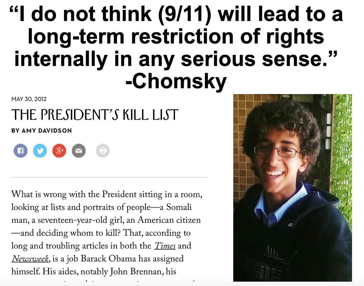 Today, the national security state says it can kill anybody, anywhere, American citizen or no, for any reason, with no due process whatsoever. The US Constitution is a dead letter. And yet here's Chomsky telling us, "Oh no, there'll be no restrictions on anybody's rights. Of course not." I think the word wrong doesn't even begin to cover that.