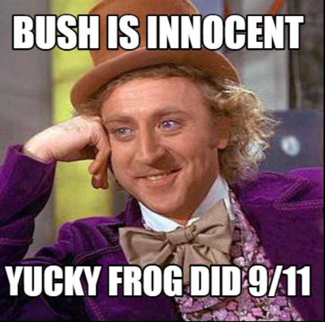 Okay. So now Chomsky says you don't need multiple doctorates from MIT to understand his point here. What is his point? Next slide. I guess it's this: "Bush is innocent, yucky frog did 9/11."