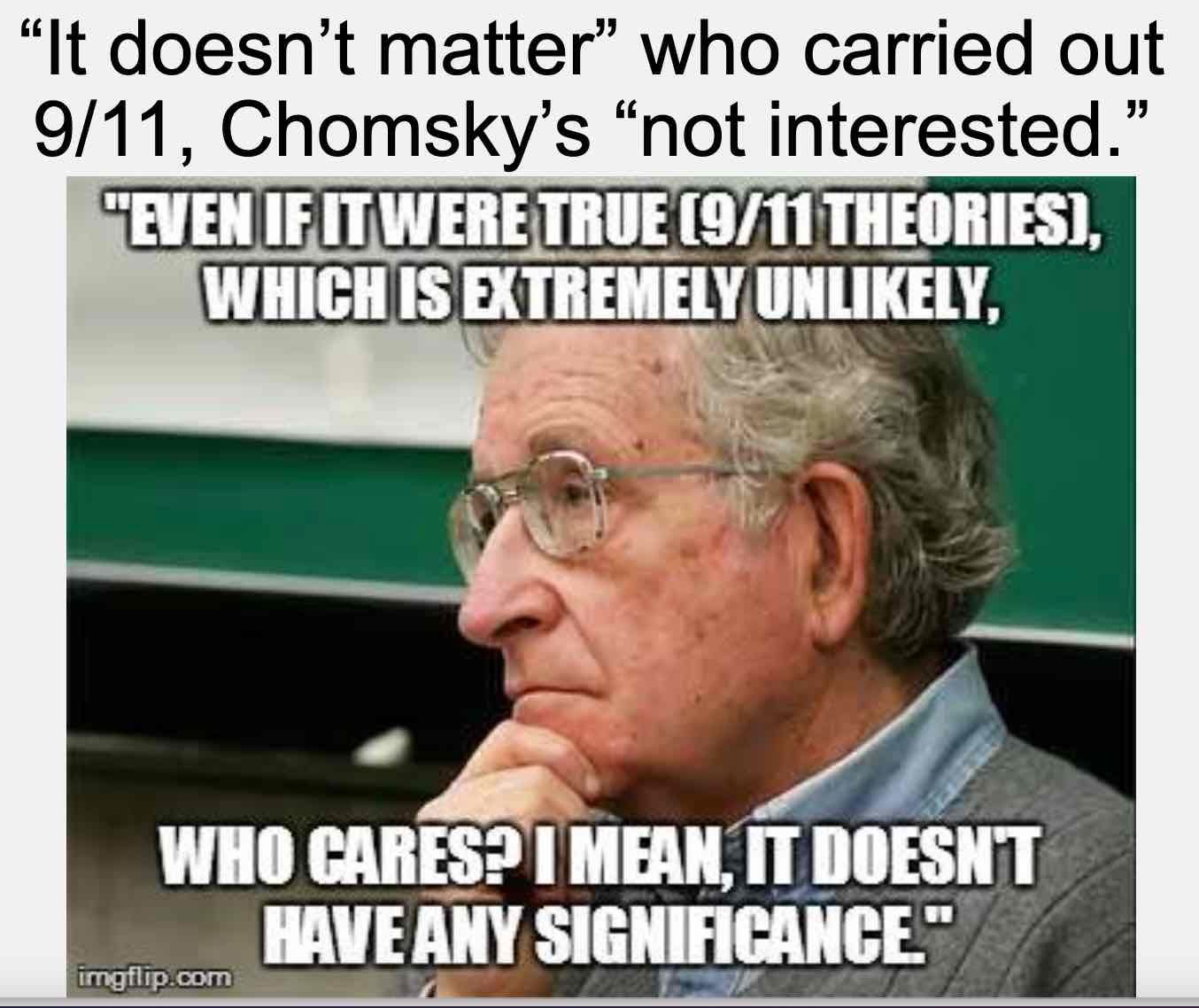 So Chomsky tells us that it doesn't matter who carried out 9/11. Now he's denied saying this, but he has said it in various words at various times. He says "even if these conspiracy theories were true, which is extremely unlikely, who cares? I mean, it doesn't have any significance." Again, this is a kind of argument that on its face, doesn't even rise to the level of being wrong, because to be wrong it has to mean something. It has to have some kind of coherence or be in some kind of discernible relationship with reality to to be wrong. And this is so bizarre, so Alice in Wonderland-ish, that you can't even say he's wrong.