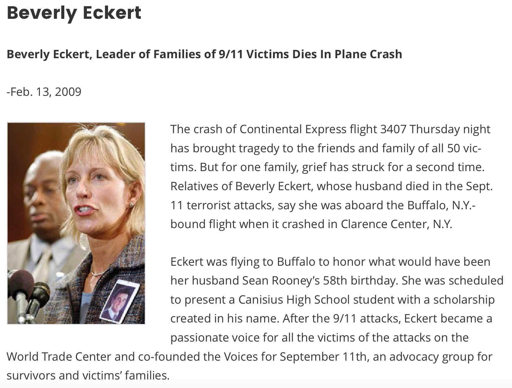 Beverley Eckert was (alongside Bob McIlvaine) the most outspokenly pro-9/11 truth family member. The Jersey Girls right now, as you may know, are pushing the 28 pages that blame the Saudis as what Barbara Honegger called the limited hangout. Beverly Eckert wasn't down with any limited hangouts. And right after meeting with President Obama, this outspoken pro-9/11 truth family member went down in a plane crash..