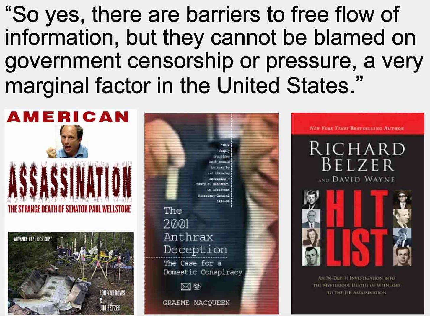 And tell that to the hundreds—well, there are 50 in the book Hit List—but there were undoubtedly hundreds of people murdered to cover up the JFK assassination. I'm told by intelligence sources (but can't confirm) that probably hundreds have also been killed to cover up 9/11, including many people here in New York (some of whom were) supposedly killed to cover up the issue of the exploding vans, the attempts to blow up the bridges and tunnels on 9/11. I don't know if that's true or not. I haven't had that fully confirmed. But in any case, murdering hundreds and hundreds of people to cover up high crimes of state—I think we could call that government pressure or censorship.