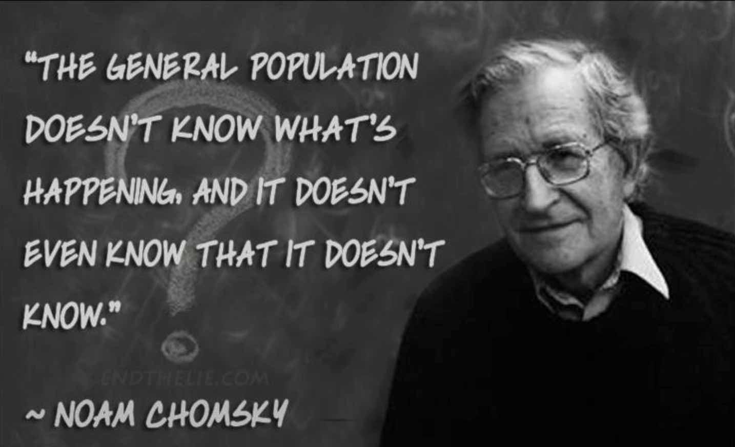 But just because Chomsky can be very, very wrong on these matters doesn't mean he's wrong about everything. He's certainly right about this: that "the general population doesn't know what's happening and doesn't even know that it doesn't know."