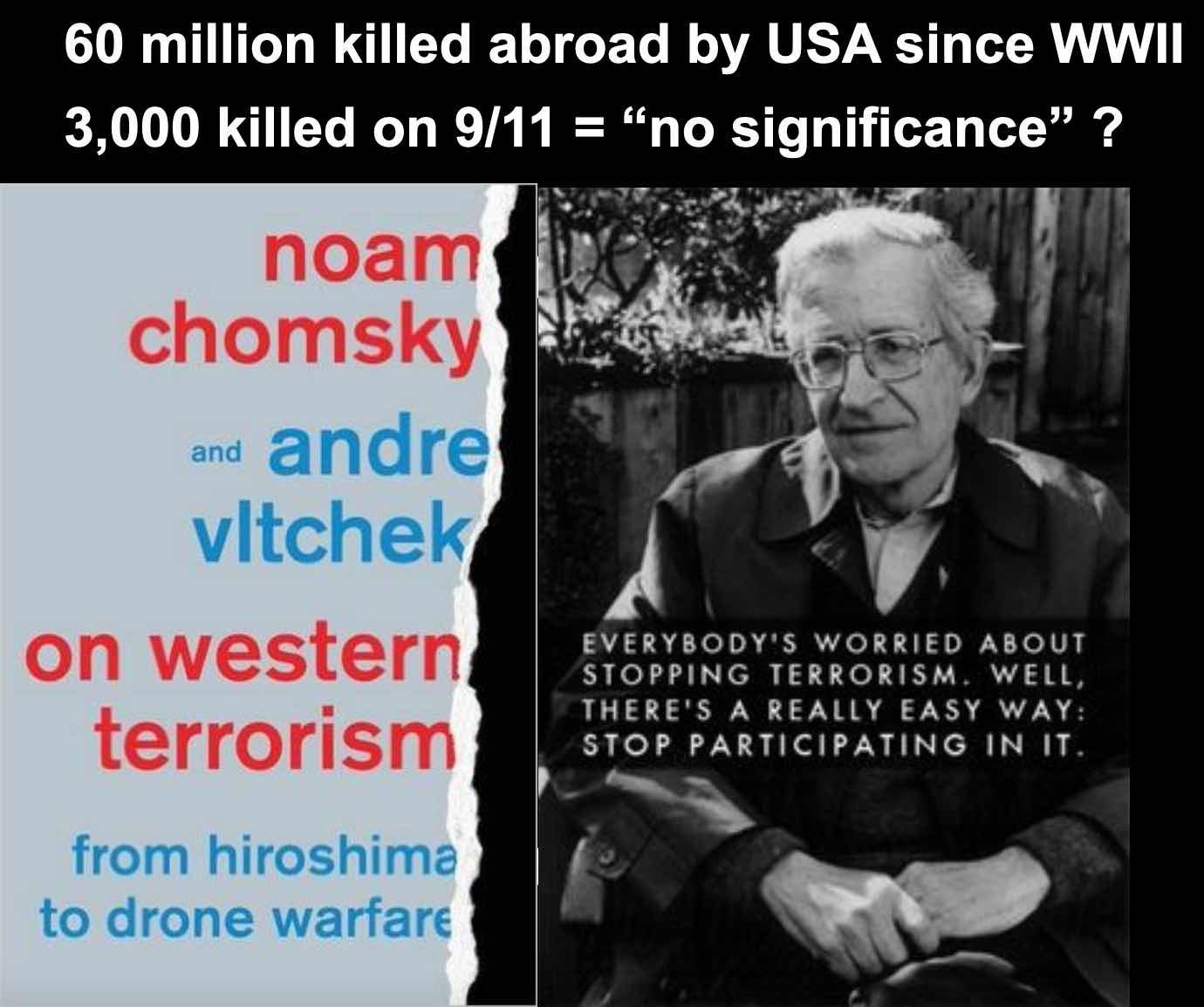 You've got to give him his due. I'm friends with Andre Vltchek, Chomsky's co-author of On Western Terrorism. Andre is a regular global roving correspondent for my radio show, Truth Jihad Radio. Andre and Noam counted up the victims of Western terrorism since World War Two in US military interventions all over the world, and came up with something like 55 to 60 million people murdered by our tax dollars, virtually all of them innocent civilians. So he has a point when he points out that these crimes are vastly greater than 9/11, in terms of the number of victims and the overall detrimental impact on humanity. And people like Andre Vltchek are really disgusted at the way Americans have built a false religion around the 9/11 attack, as though it were the worst, most horrific massacre in all of history. "And we've got to devote the rest of our lives to shredding the Constitution and hunting down the evil perpetrators, yadda, yadda, yadda." I understand why people like Chomsky and Vltchek find that obnoxious, and I fully agree with that.