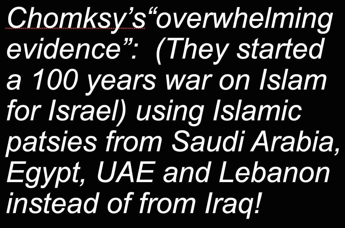 Chomsky is telling us that this is the main point he's used over and over and over to argue that in fact it couldn't have been an inside job: "because they would have used Iraqi hijackers." So he's just taking for granted that the entire purpose of 9/11 was to launch a war on Iraq, and that there would be no way you could launch a war on Iraq based on the public relations effect of a new Pearl Harbor, like 9/11, that had hijackers from Saudi Arabia—15 of them, as well as Egypt, the United Arab Emirates and Lebanon.