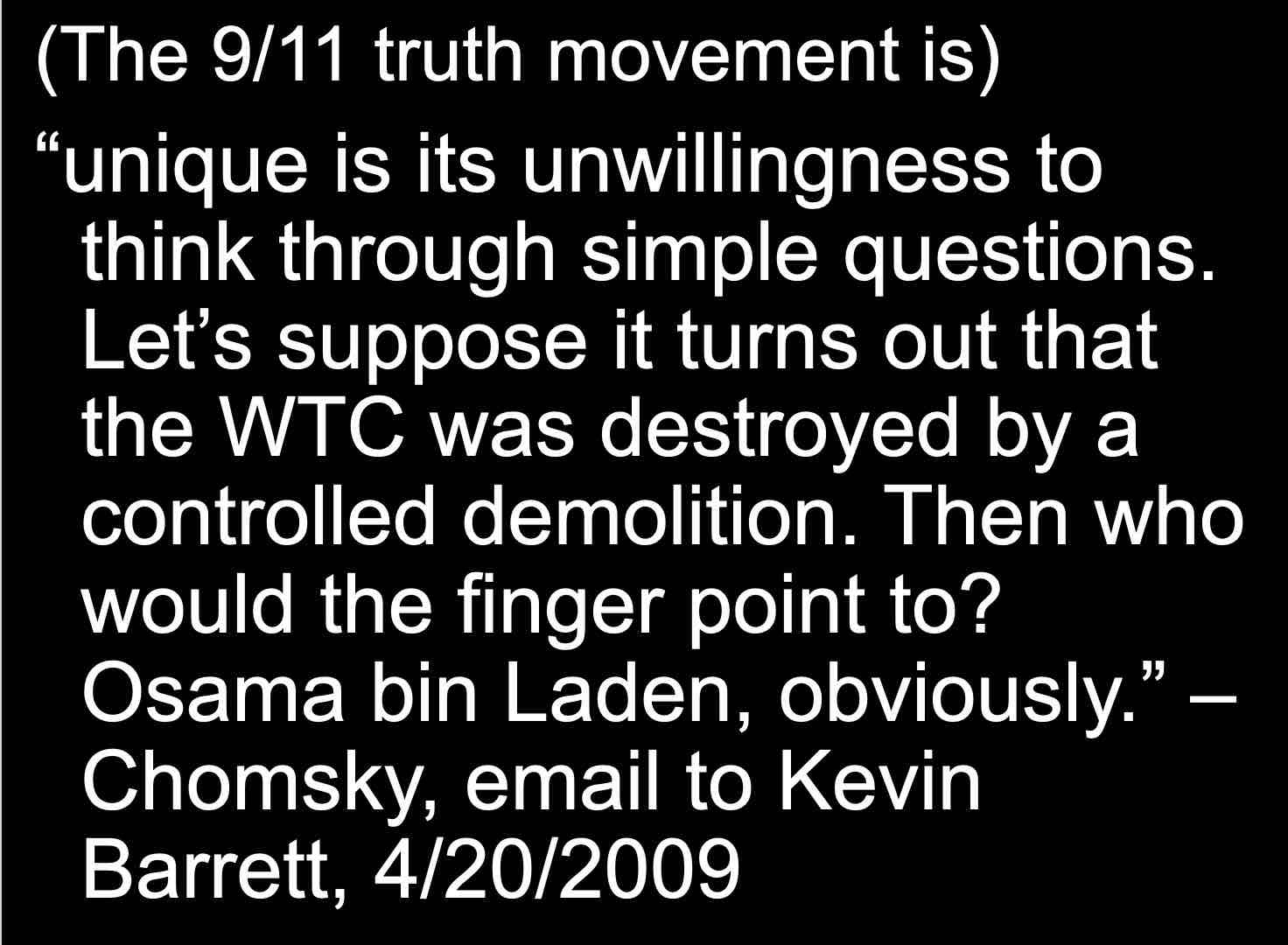 In the next slide, he charges that the 9/11 truth movement is, "unique in its unwillingness to think through simple questions. Let's suppose it turns out that the World Trade Center was destroyed by a controlled demolition. Then who would the finger point to? Osama bin Laden, obviously." (laughter)