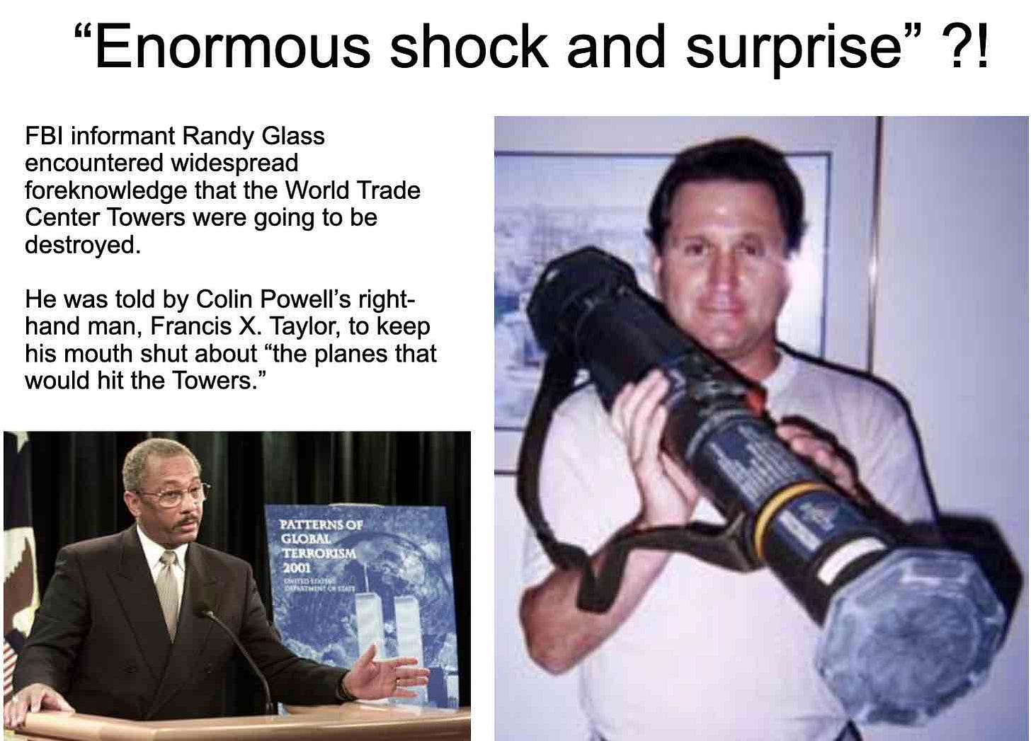 Randy Glass, FBI informant, former jewel thief, got into selling fake Stinger missiles to terrorists and busting them. Stinger sting operations. Randy Glass learned from his contacts that the World Trade Center was going to be destroyed in September 2001. When he learned this in early summer 2001, he tried to do something about it. He went to Florida Senator Bob Graham's office. He was rebuffed. He ended up being steered to Colin Powell's right hand man, Mr. Francis Taylor, who you see in in the lower slide. That's Francis Taylor with his "patterns of global terrorism 2001" placard behind him. Francis Taylor picked up the phone and said, "Randy, we know about the planes that are going to hit the Towers." Now, that's very interesting because Randy Glass had never heard it was planes. He had just heard the whole World Trade Center was going to be destroyed. He didn't know how. And Francis Taylor says, you've got to keep your mouth shut about this. Don't talk to anyone about it. Don't talk to your FBI colleagues about it. Quote-unquote: "We're tiptoeing through a nuclear minefield." That was a direct quote from Francis Taylor, Colin Powell's right hand man, telling Randy Glass to keep his mouth shut about the upcoming destruction of the World Trade Center by means of planes hitting the Towers. All of this was going on in the summer of 2001.