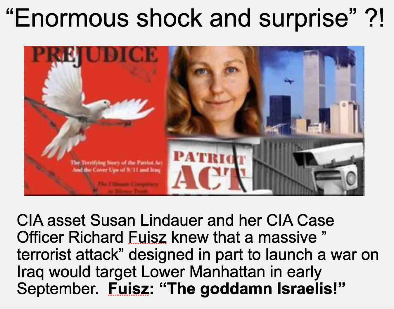How about the next slide with Susan Lindauer, a CIA asset who was held incommunicado in solitary on a Patriot Act warrant in a US military base to keep her mouth shut. She was watching 9/11 on television and on the phone with Richard Fuisz, her CIA case officer, who was later paid a couple of million dollars in hush money, and they'd known this was coming. They knew there was going to be a huge terrorist attack on Lower Manhattan in late August or early September to be blamed on Iraq, at least as one of its purposes. And on 9/11, she's on the phone with Fuisz and he starts screaming as he watches the Towers blowing up: "The goddamn Israelis, the goddamned Israelis!" Well, he's now living in a multimillion dollar mansion in Washington, D.C. that he bought with his hush money. So that was not exactly a shock and surprise. Well, I guess it was a shock and surprise to Richard Fuisz that they went that far. But they sure knew it was coming.